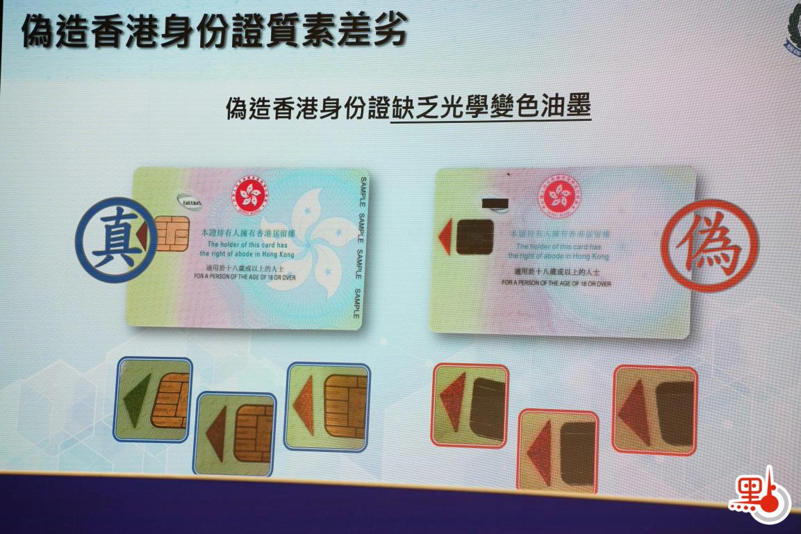 真香港身份證,持證人相片旁邊會有3朵紫荊花全息圖像,在紫外線照射下會顯示出彩色維港和青馬大橋的煙花圖;身份證背面三角形是光學變色油墨圖案,會隨着觀察角度轉變而變紅色或者綠色。偽造香港身份證則欠缺以上特徵。入境處表示,市民只要細心觀察,就可以輕易辨別香港身份證的真偽。