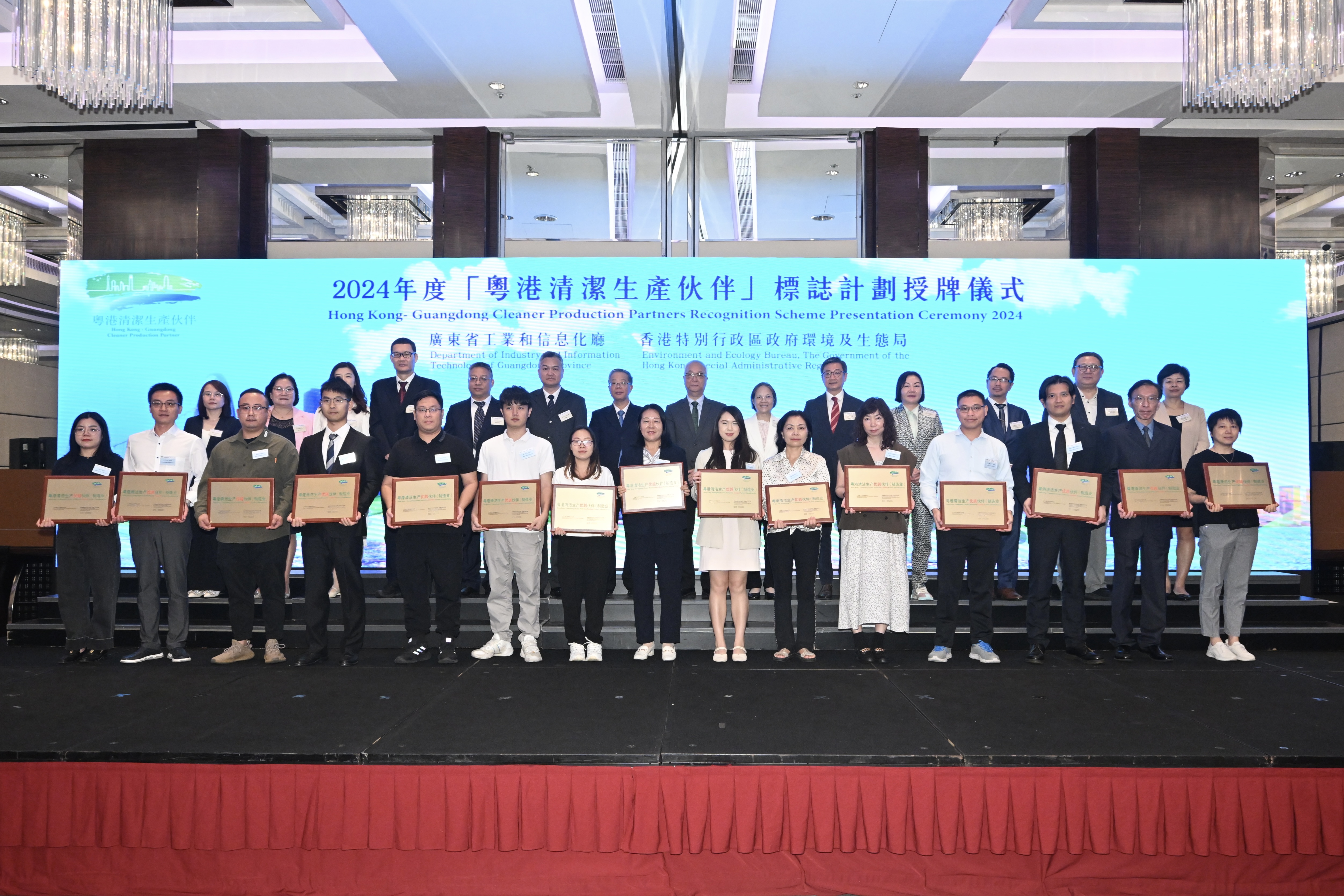 專責小組第十一次會議後舉行了2024年度標誌計劃授牌儀式,以表揚積極落實清潔生產的企業。今年共有215家企業獲頒授標誌牌,當中42家港資製造業企業獲優越夥伴標誌,149家港資製造業企業則獲夥伴標誌。其餘獲頒授標誌牌的企業包括三家採購商及21家環境技術服務供應商。