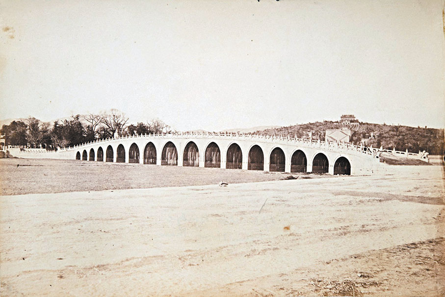 中國地大物博、景色優美,既有曼妙的自然風景,也有底蘊深厚的人文景觀。一山一水、一草一木、亭台樓閣、文化遺存,無不彰顯着「大美中國」的宏偉山河和精妙的人文意蘊。在本次展覽中,觀眾可以透過這些老照片,感受一兩百年前中國的文化藝術與景觀藝術之美。譬如這張攝於1870年代的清漪園十七孔橋,十七孔橋是清漪園(現名頤和園)中連接昆明湖東岸和南湖島的長橋,建於清乾隆年間。每年冬至前後下午四點左右,夕陽的光正好回穿過東橋,將橋洞和附近的水面染成金黃色,即著名的「金光穿洞」一景,吸引無數攝影愛好者。此外,在展覽中還可以看到廣州鎮海樓和沙面、福州的烏塔和白塔、鎮江金山寺、廈門南普陀寺、杭州靈隱寺、上海豫園等老照片。
