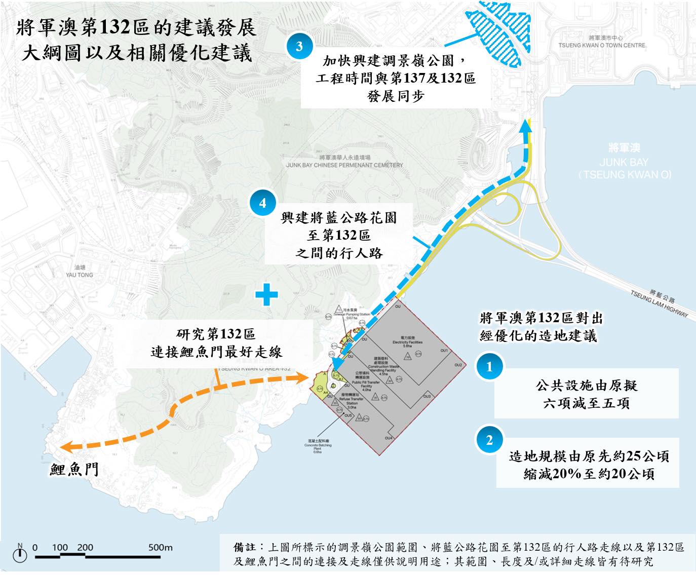 發展局在社交專頁表示,就第132區,最新提出的建議包括減少所設置的公共設施,由原擬的6項減至5項,距離最近屋苑有1公里或以上,並縮減造地規模,由原先約25公頃縮減20%、至約20公頃;加快興建調景嶺公園;興建將藍公路花園至第132區的行人路,並研究第132區連接鯉魚門最好的走線。