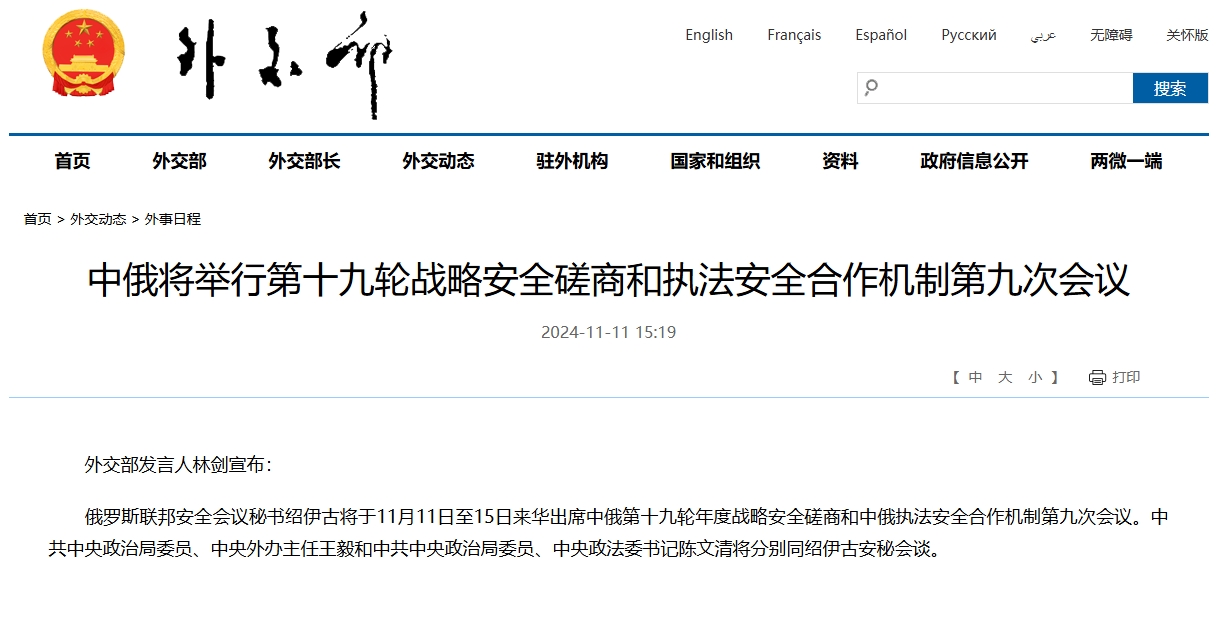 【點新聞報道】據外交部網站今日(11日)消息,外交部發言人林劍宣布,俄羅斯聯邦安全會議秘書紹伊古將於11月11日至15日來華出席中俄第十九輪年度戰略安全磋商和中俄執法安全合作機制第九次會議。中共中央政治局委員、中央外辦主任王毅和中共中央政治局委員、中央政法委書記陳文清將分別同紹伊古安秘會談。