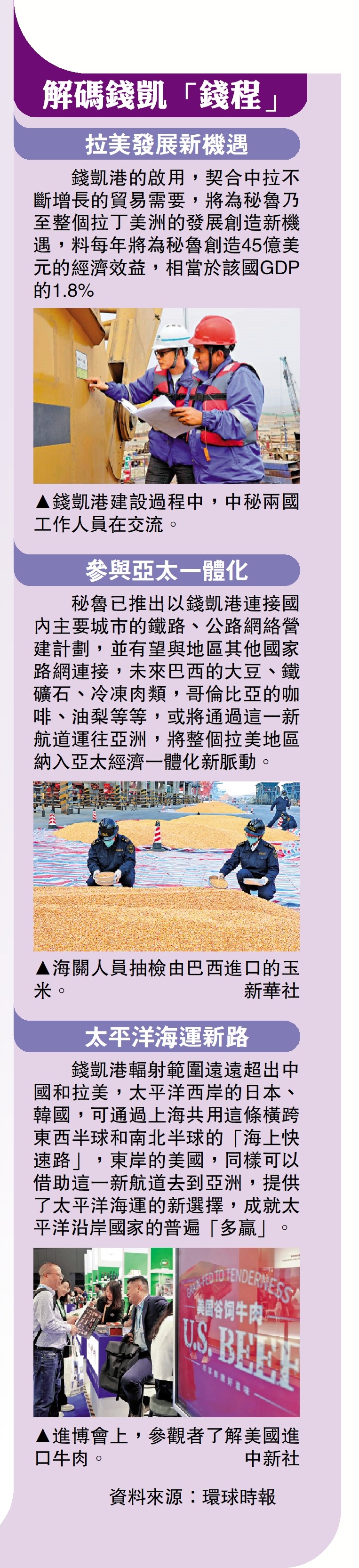作為「海上快速路」進入拉美的第一站,秘魯的蔓越莓、牛油果將以更快速度、更低成本運往太平洋對岸。秘魯已經推出了以錢凱港連接國內主要城市的鐵路、公路網絡營建計劃,並且將有望與地區其他國家路網連接,未來巴西的大豆、鐵礦石、冷凍肉類,哥倫比亞的咖啡、油梨等等或也將通過這一新航道源源不斷地運往亞洲。這將為整個拉美地區打開一扇門,將其納入亞太經濟一體化的新脈動。