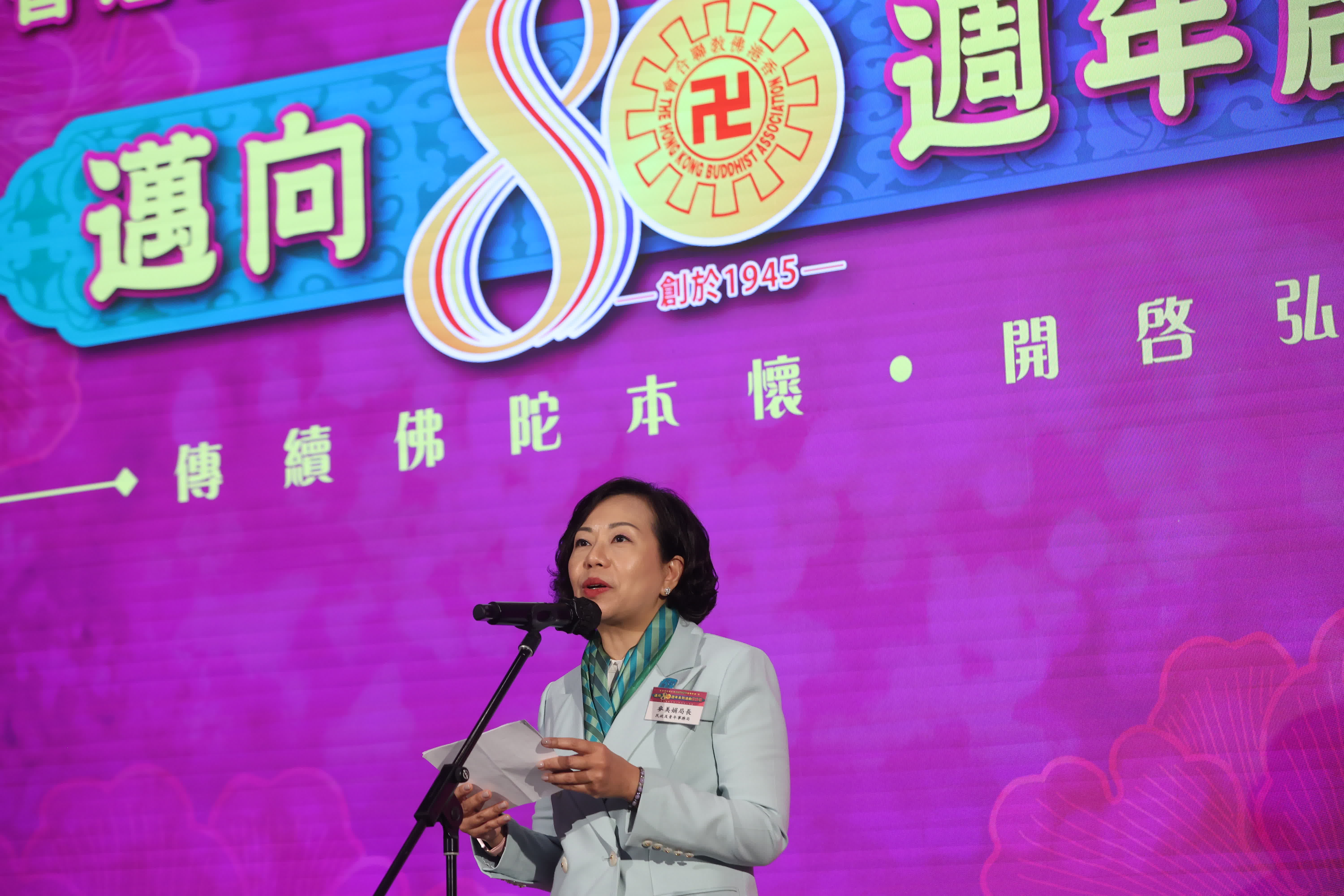 主禮嘉賓、特區政府民政及青年事務局局長麥美娟致祝賀辭表示,佛聯會默默耕耘近80年,如今是本港最具規模的佛教團體。佛聯會一直弘揚佛法,更積極投入教育、醫療和公益事業,服務對象涵蓋幼兒、青少年、長者,全面實踐慈悲喜捨的精神,福澤社群。展望將來,她期望佛聯會繼續弘揚正法,利惠眾生,與特區政府及各界一同凝聚大眾,促進香港和諧共融。