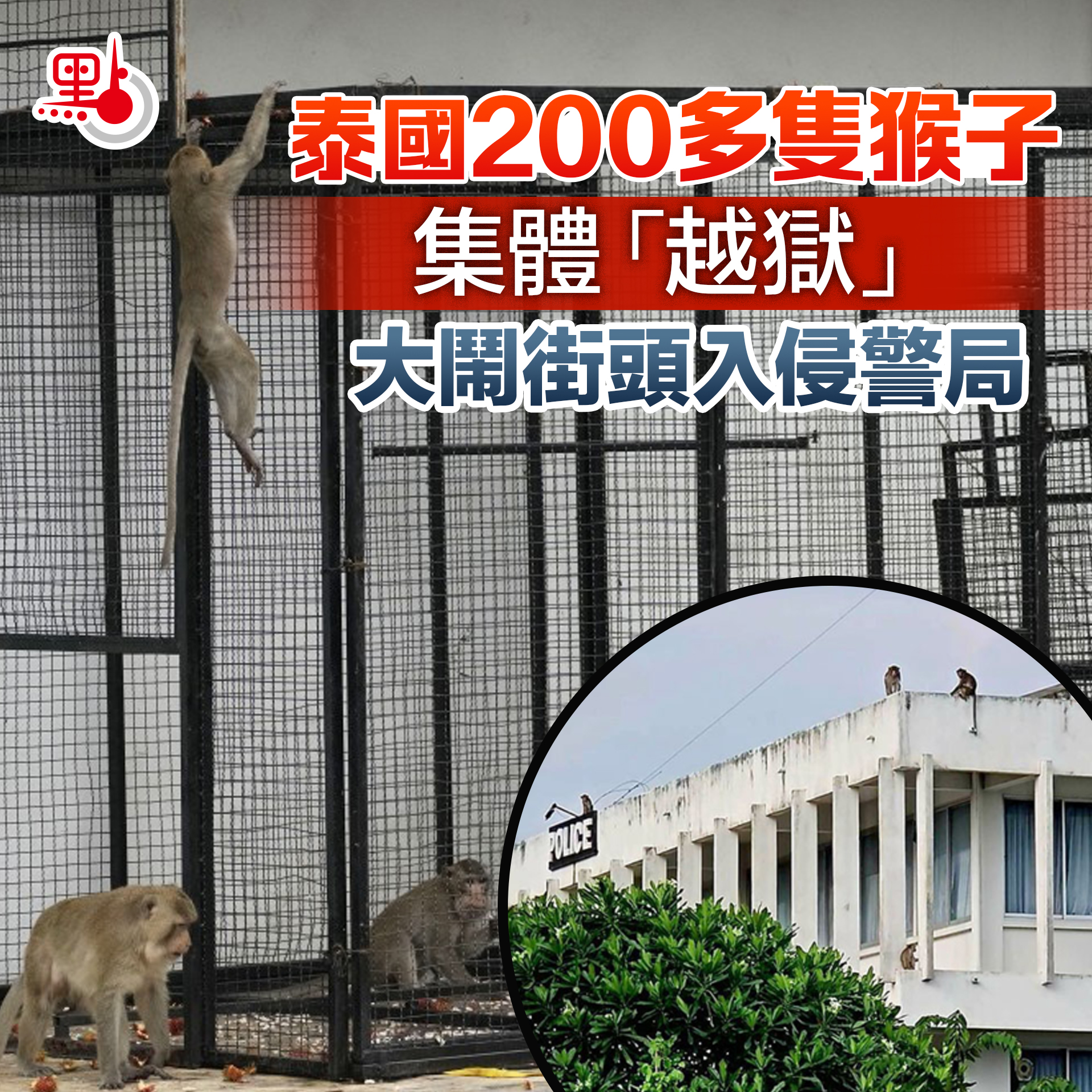 【點新聞報道】本月16日,泰國華富里府(Lopburi)約200隻猴子破壞動物保育中心的牢籠並逃走。牠們衝上街頭,闖入民宅討要食物,甚至集體入侵鄰近的警察局。警察甚至需要躲入警局,緊閉門窗來保護財產。目前僅40隻猴子回到籠裏,官方正派人捕捉其餘仍在逃的猴子。
