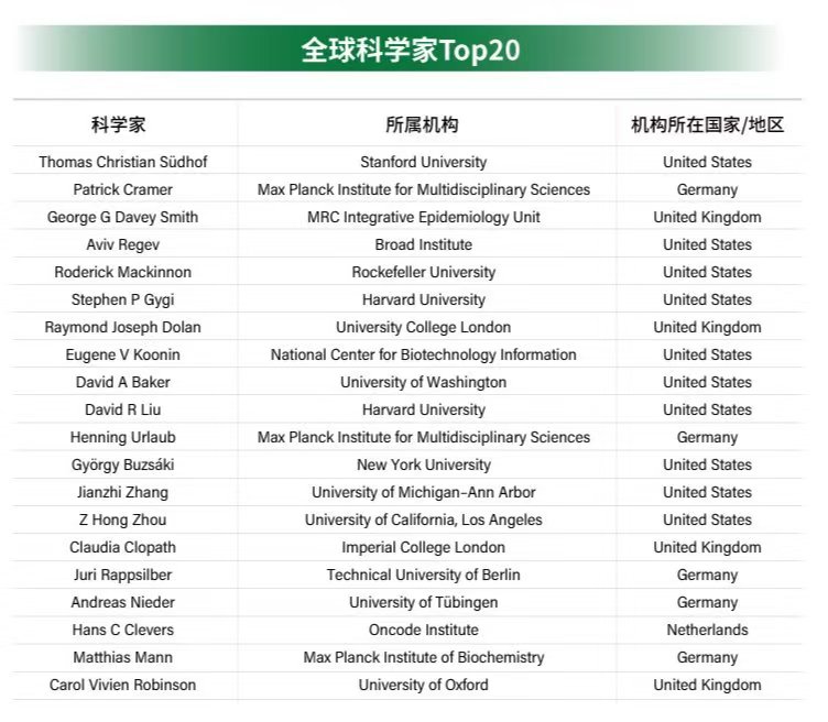 榜單顯示,全球貢獻份額TOP20的科學家中,美國科學家共10位,佔據一半;德國科學家則有5位。
