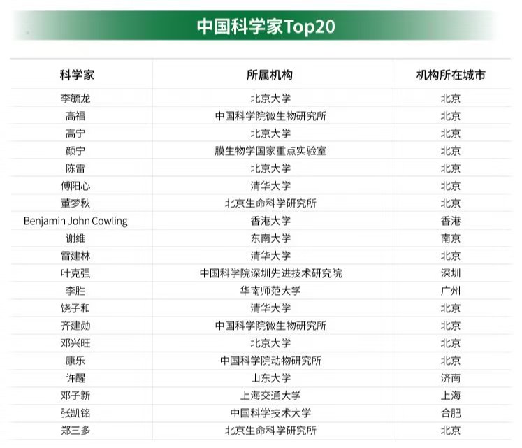 中國貢獻份額TOP20的科學家中,13位來自北京,1位來自港大。數據顯示,中國擁有的前10%科學家數量為全球第三。