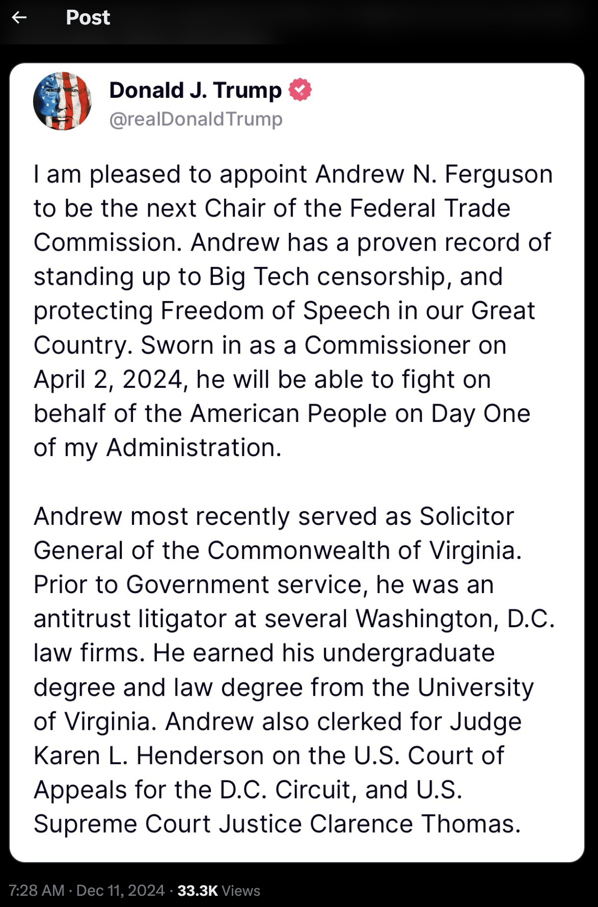 值得注意的是,弗格森的提名需要經過參議院的確認。所以目前的任命還不算是板上釘釘的決議。如果提名獲得通過,他將領導FTC繼續執行反壟斷法,保護消費者權益,監督市場公平競爭。