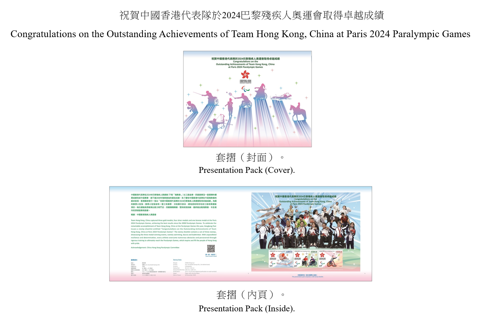 此外,中國香港代表隊亦在巴黎殘奧會中以3面金牌、4面銀牌及1面銅牌的優異成績完成今屆賽事,創下繼2008年殘奧會後的最佳成績。為了慶祝中國香港代表隊在今屆殘奧會的超卓表現,香港郵政將發行一張以「祝賀中國香港代表隊於2024巴黎殘疾人奧運會取得卓越成績」為題的郵票小型張及相關集郵品。郵票小型張嵌有一套3枚郵票,分別展示游泳、硬地滾球和羽毛球3個得獎運動項目。每位運動員憑着無比毅力和鬥志,克服種種障礙,堅持刻苦訓練,最終能出戰殘奧會,令全港市民深感鼓舞和自豪。