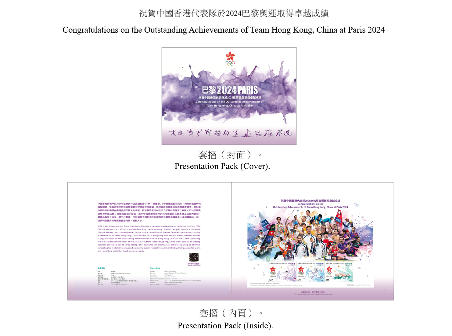 中國香港代表隊於今年巴黎奧運中憑着堅毅的決心,勇奪兩枚金牌和兩枚銅牌,是香港首次於同屆奧運會中取得兩金的佳績,亦是首次連續兩屆取得奧運會獎牌。為紀念中國香港代表隊在奧運會創下驕人的成績,香港郵政將發行一款以「祝賀中國香港代表隊於2024巴黎奧運取得卓越成績」為題的郵票小型張及相關郵品,展示中國香港代表隊共35名運動員在比賽場上出色的表現。郵票小型張上嵌有一套3枚郵票,分別呈現了運動員在劍擊及游泳賽事中竭盡全力角逐獎牌的一刻,並展現對體育的熱愛及香港精神,觸動人心。