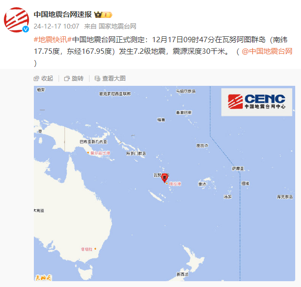 中國地震台網正式測定,北京時間12月17日9時47分在瓦努阿圖群島(南緯17.75度,東經167.95度)發生7.2級地震,震源深度30千米。