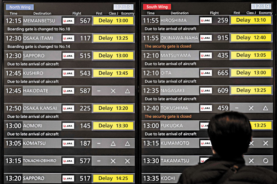 當日上午約10時30分,羽田機場一號客運大樓出境大廳的日航櫃枱前,大批遊客排起長龍、等候辦理登機手續。不少焦急的遊客不斷詢問地勤人員,以及檢查手機上的應用程式資訊。行李託運櫃枱前亦有大批遊客等待。在大阪關西機場,日航一架原定上午10時15分飛往上海的航班也出現延誤。