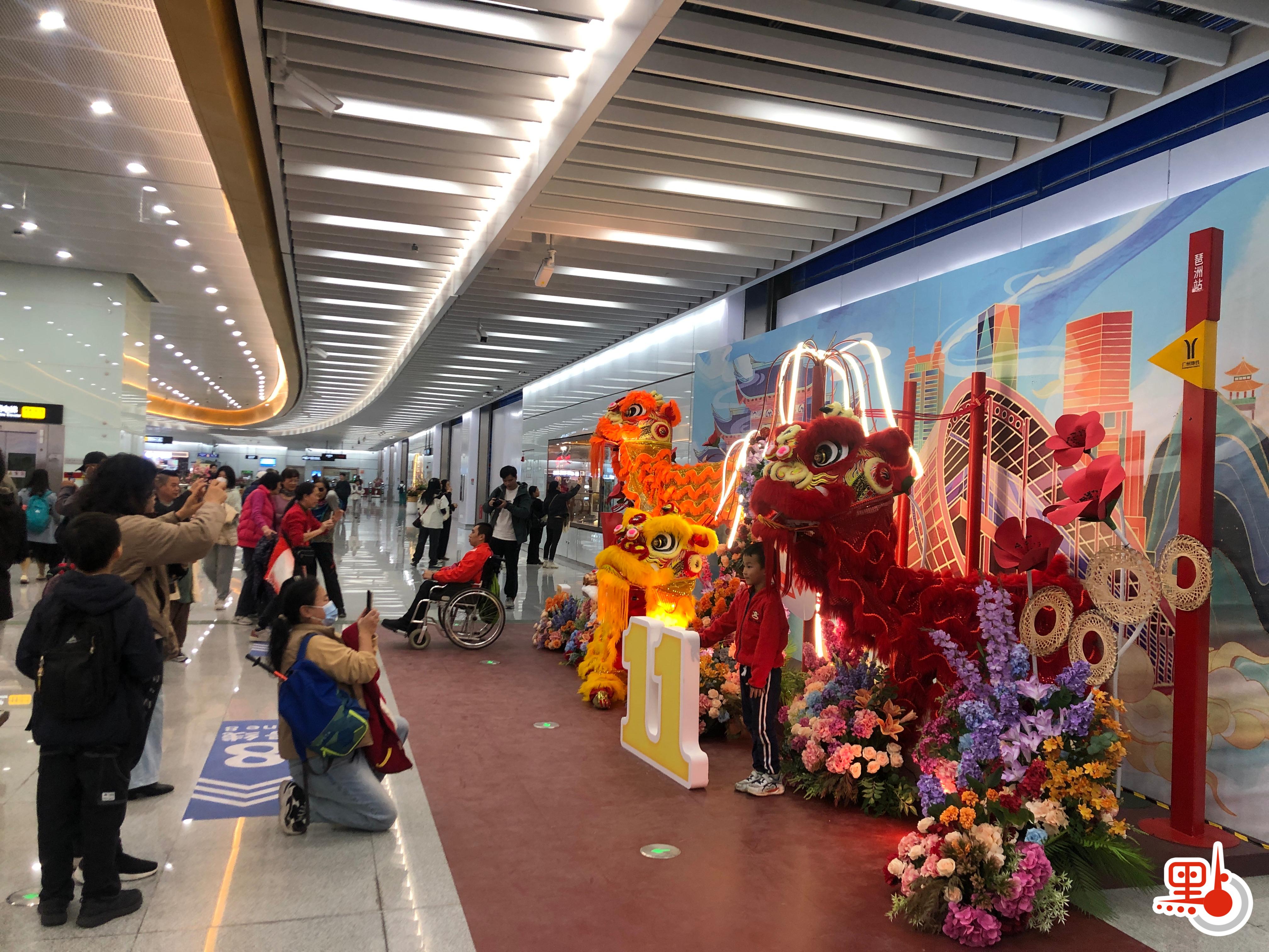 廣州地鐵有關負責人表示,新線串聯了老城新城,涵蓋具有嶺南特色的飲食、文化、商貿、景區等。廣州地鐵在11號線植入非遺元素,從沿線五個區各選取一個站點作為非遺重點站,車站設計融合粵劇、廣彩瓷、廣東醒獅、廣雕、廣綉、傳統醫藥等具有代表性的非遺項目,打造全國首條非遺示範線。記者在現場也看到,5個非遺重點站設計了文化展示櫥窗、藝術品展示牆、LED多媒體展示屏等,將非遺項目與重點站進行融合設計,吸引乘車的民眾紛紛駐足「打卡」。
