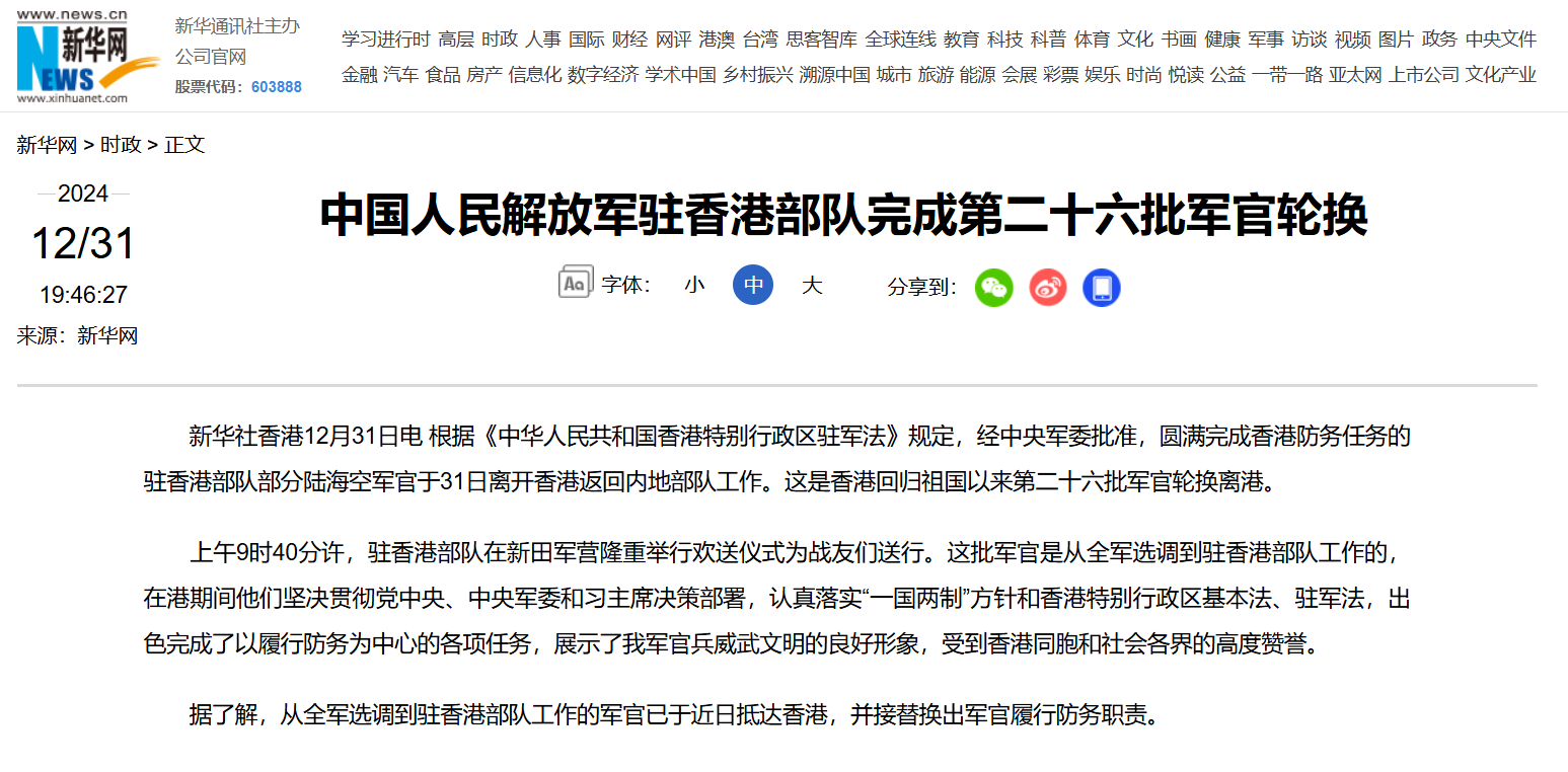 【點新聞報道】據新華社報道,根據《中華人民共和國香港特別行政區駐軍法》規定,經中央軍委批准,圓滿完成香港防務任務的駐香港部隊部分陸海空軍官於31日離開香港返回內地部隊工作。這是香港回歸祖國以來第26批軍官輪換離港。