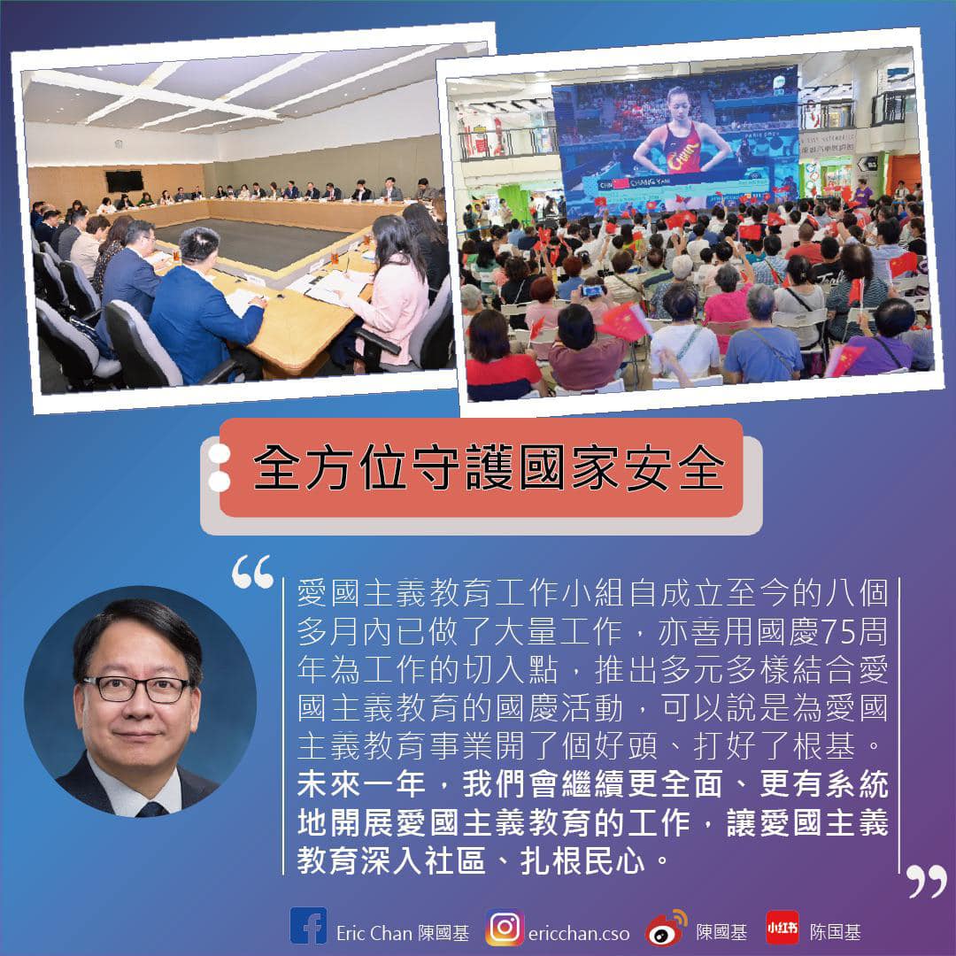 第一,當局全方位守護國家安全,做好推廣愛國主義教育的工作。過去一年,特區政府完成基本法第二十三條立法,進一步築牢維護國家安全的法律屏障。「愛國主義教育工作小組」成立至今,亦舉辦大量結合愛國主義教育活動,讓愛國主義教育深入社區、扎根民心。