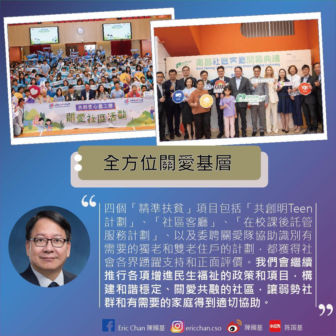 此外,當局全方位關愛基層,建立互助共融的社會。「社區客廳」計劃自推出以來好評如潮,全年服務約27萬人次。