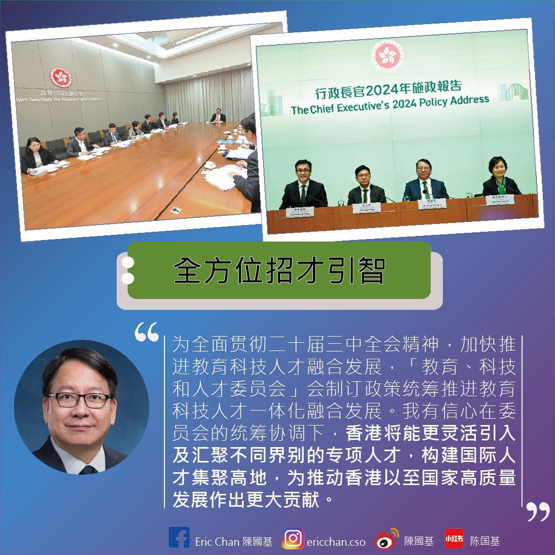 第二,當局全方位招才引智,推動國際高端人才集聚香港。截至去年11月底,各項人才入境計劃共收到約42萬宗申請,批出約26萬宗,期間已有約17.5萬名人才攜同家人來港,壯大香港的人才庫。