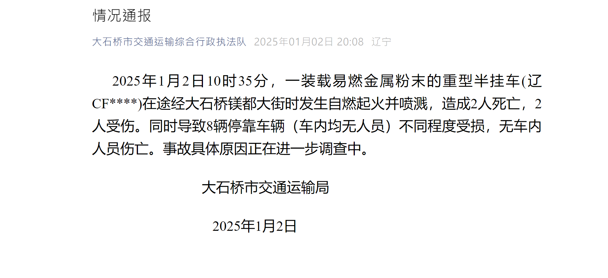 【點新聞報道】據遼寧省大石橋市交通運輸綜合行政執法隊微信公眾號消息,2025年1月2日10時35分,一裝載易燃金屬粉末的重型半挂車(遼CF****)在途經遼寧大石橋鎂都大街時發生自燃起火並噴濺,造成2人死亡,2人受傷。同時導致8輛停靠車輛(車內均無人員)不同程度受損,無車內人員傷亡。事故具體原因正在進一步調查中。