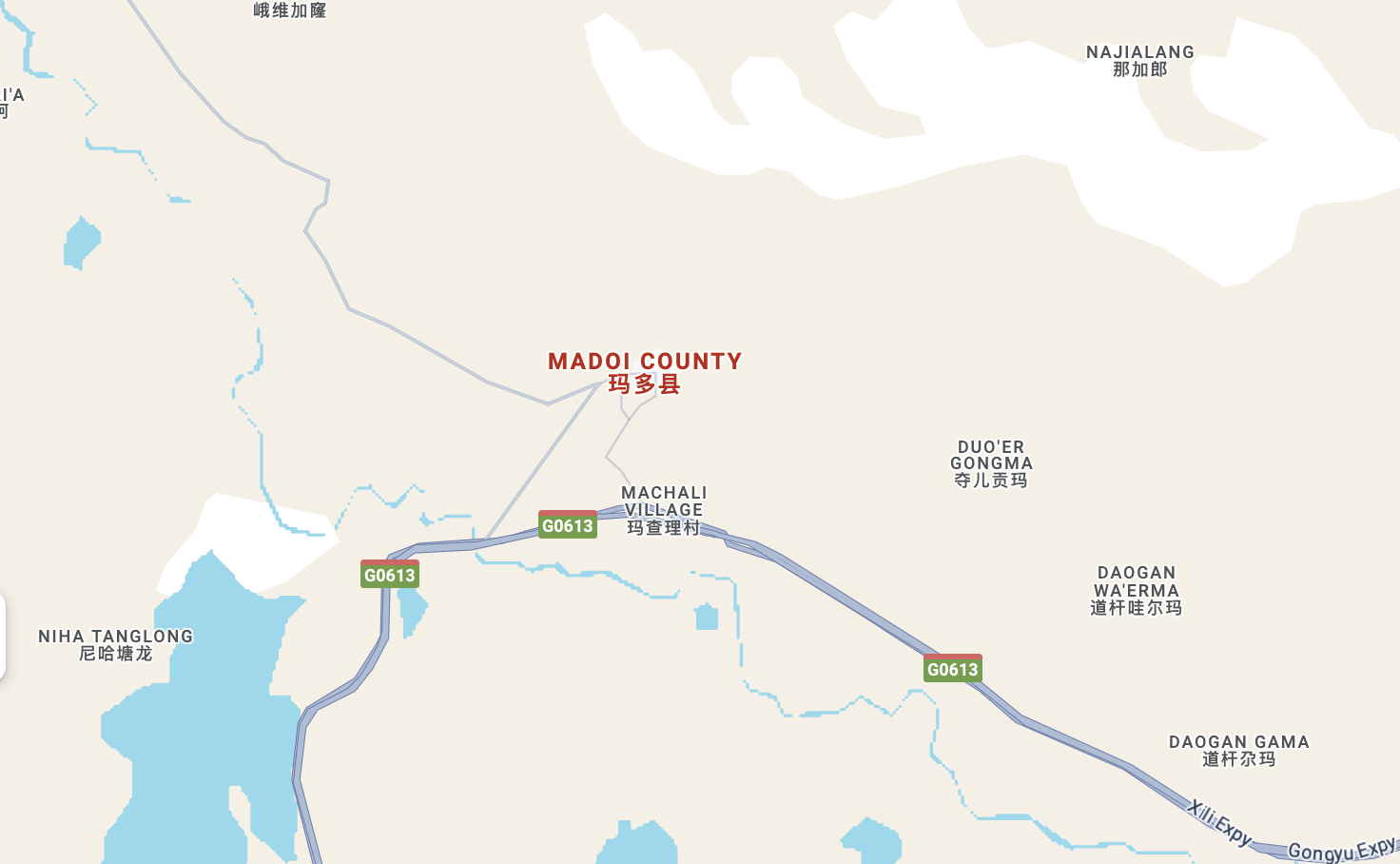 震中位於高原,人口稀少,周邊5公里範圍內平均海拔約4270米。震中距瑪多縣城65公里,距西寧市437公里。