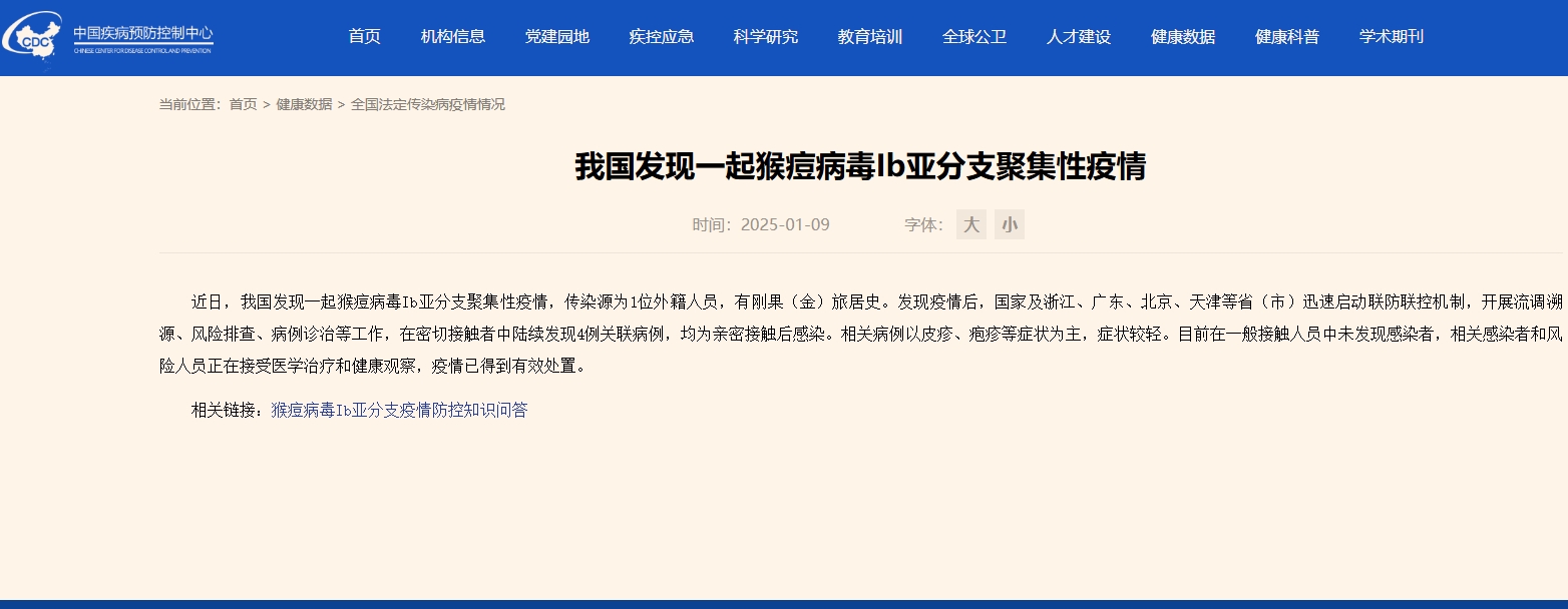 【點新聞報道】中國疾控中心今日(9日)表示,近日內地發現一起猴痘病毒Ib亞分支聚集性疫情,傳染源為1位外籍人員,有剛果(金)旅居史。