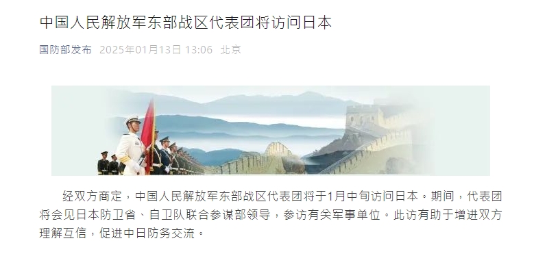 【點新聞報道】據國防部今日(13日)消息,經雙方商定,中國人民解放軍東部戰區代表團將於1月中旬訪問日本。期間,代表團將會見日本防衛省、自衛隊聯合參謀部領導,參訪有關軍事單位。此訪有助於增進雙方理解互信,促進中日防務交流。