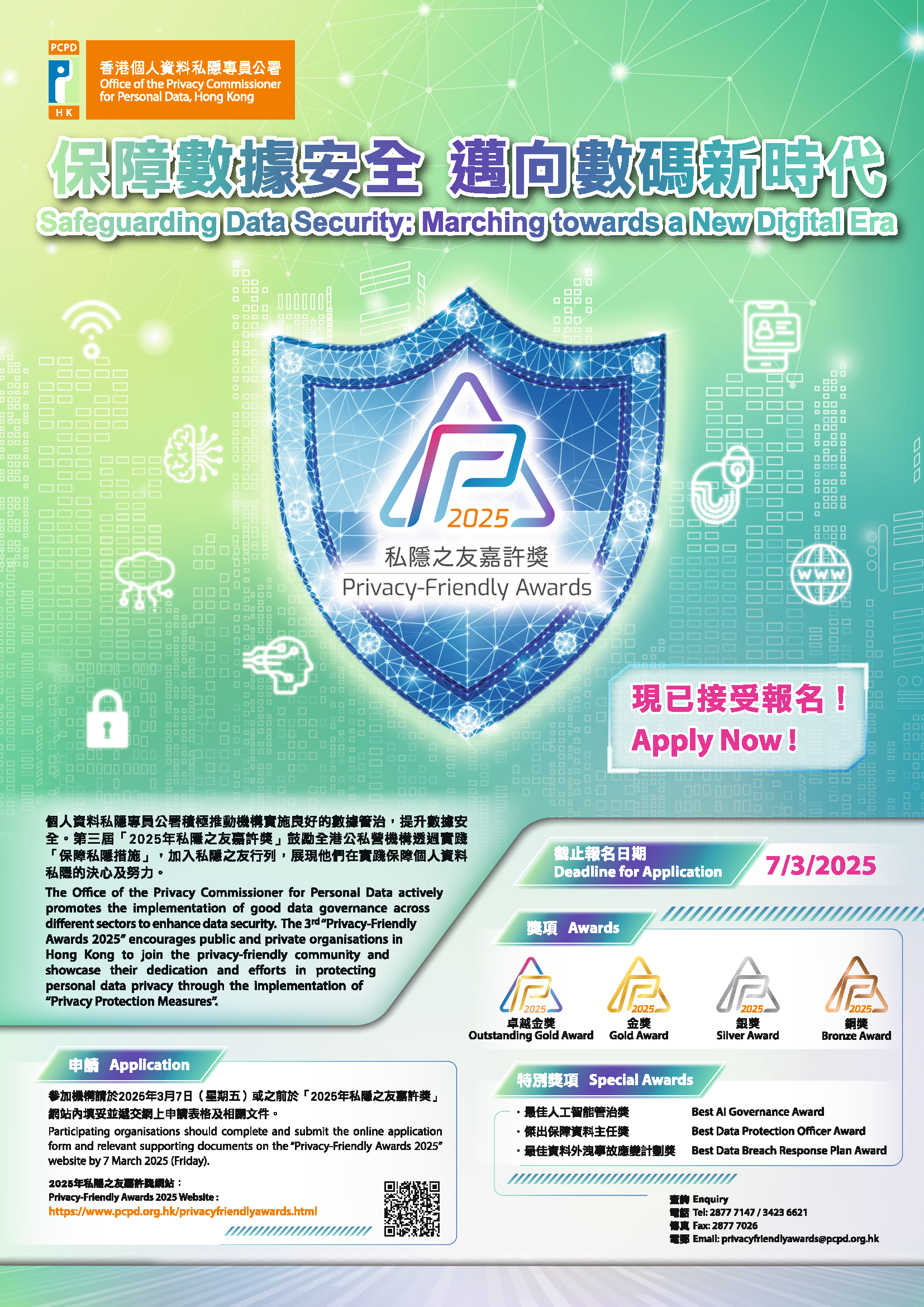 【點新聞報道】由個人資料私隱專員公署主辦的「2025年私隱之友嘉許獎」今日(13日)起接受報名。今屆嘉許獎以「保障數據安全 邁向數碼新時代」為主題,旨在表揚及嘉許機構在保障個人資料私隱的決心及表現,同時鼓勵機構實施良好的數據管治,提升機構保障個人資料私隱的意識及數據安全。