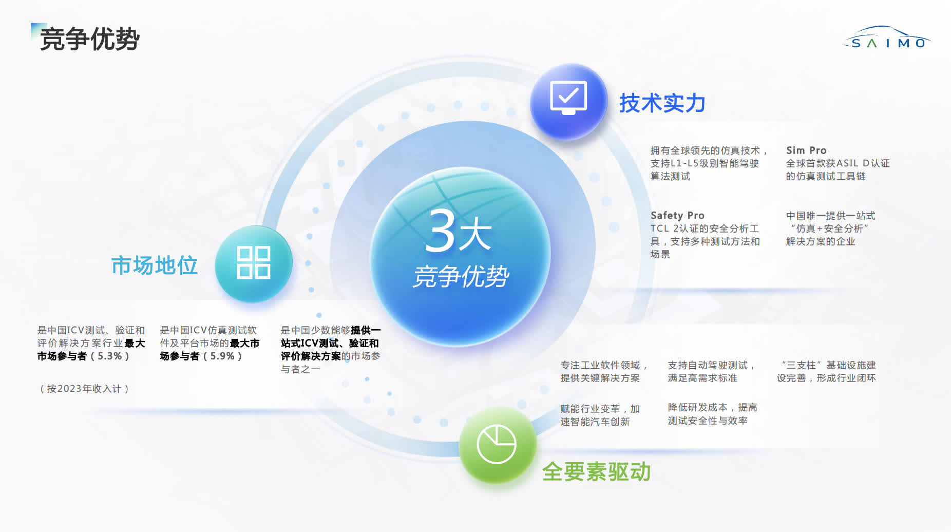 賽目科技總經理何豐演講時指出,賽目科技是中國ICV測試、驗證和評價解決方案行業以及ICV仿真測試軟件及平台市場的最大參與者,也是少數能提供一站式解決方案的企業之一。公司通過自主研發,擁有全球領先的仿真技術,並構建了覆蓋仿真、封閉場地和開放道路的「三支柱」能力體系,為智能駕駛提供強有力的技術支撐。