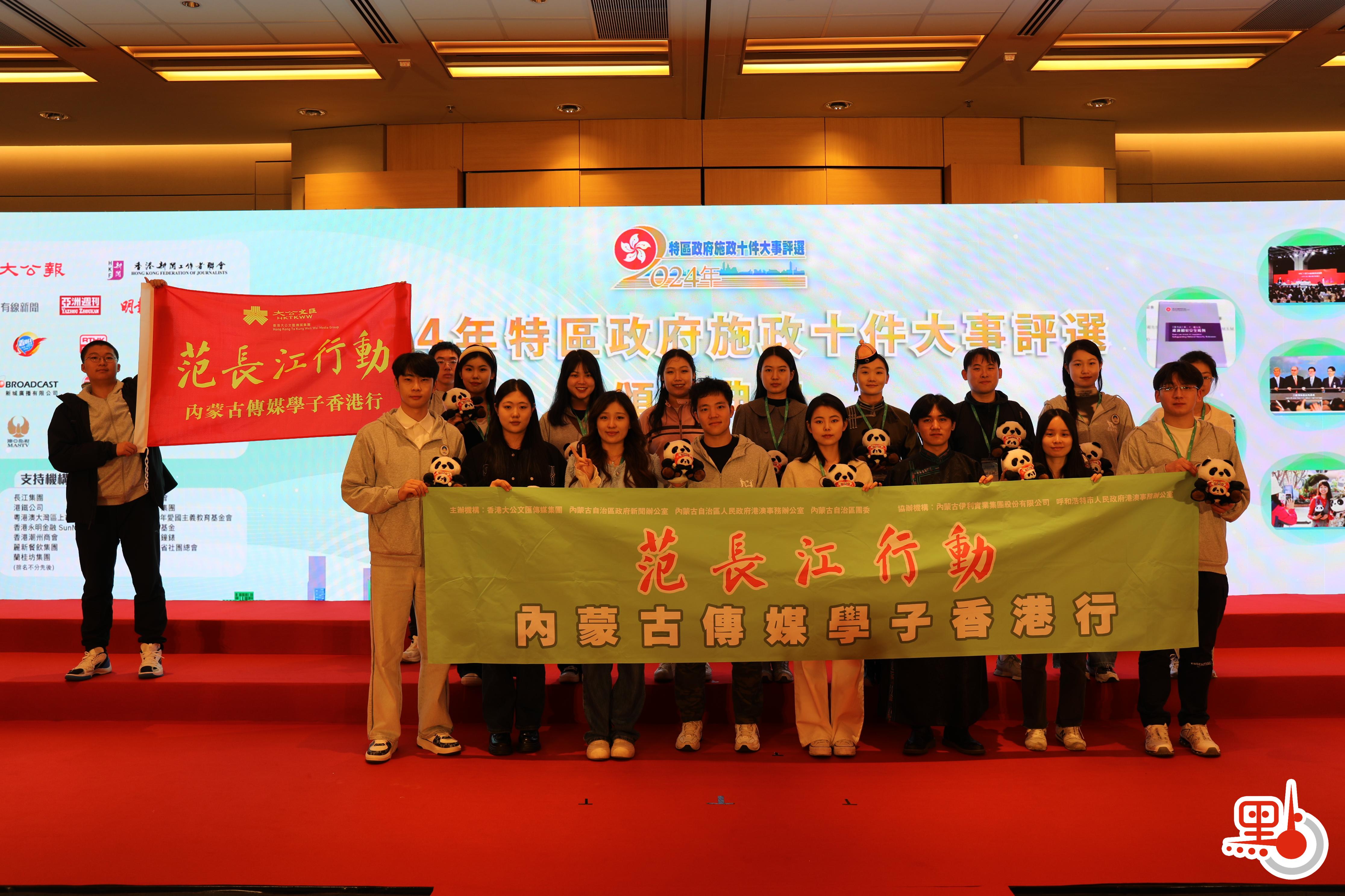 【點新聞報道】1月21日,「2024年特區政府施政十件大事評選」頒獎典禮在香港會議展覽中心隆重舉行。參加「范長江行動—首屆內蒙古傳媒學子香港行」活動的同學們有幸參與其中,共同見證了這一重要時刻,並與香港特區行政長官李家超親切合影。
