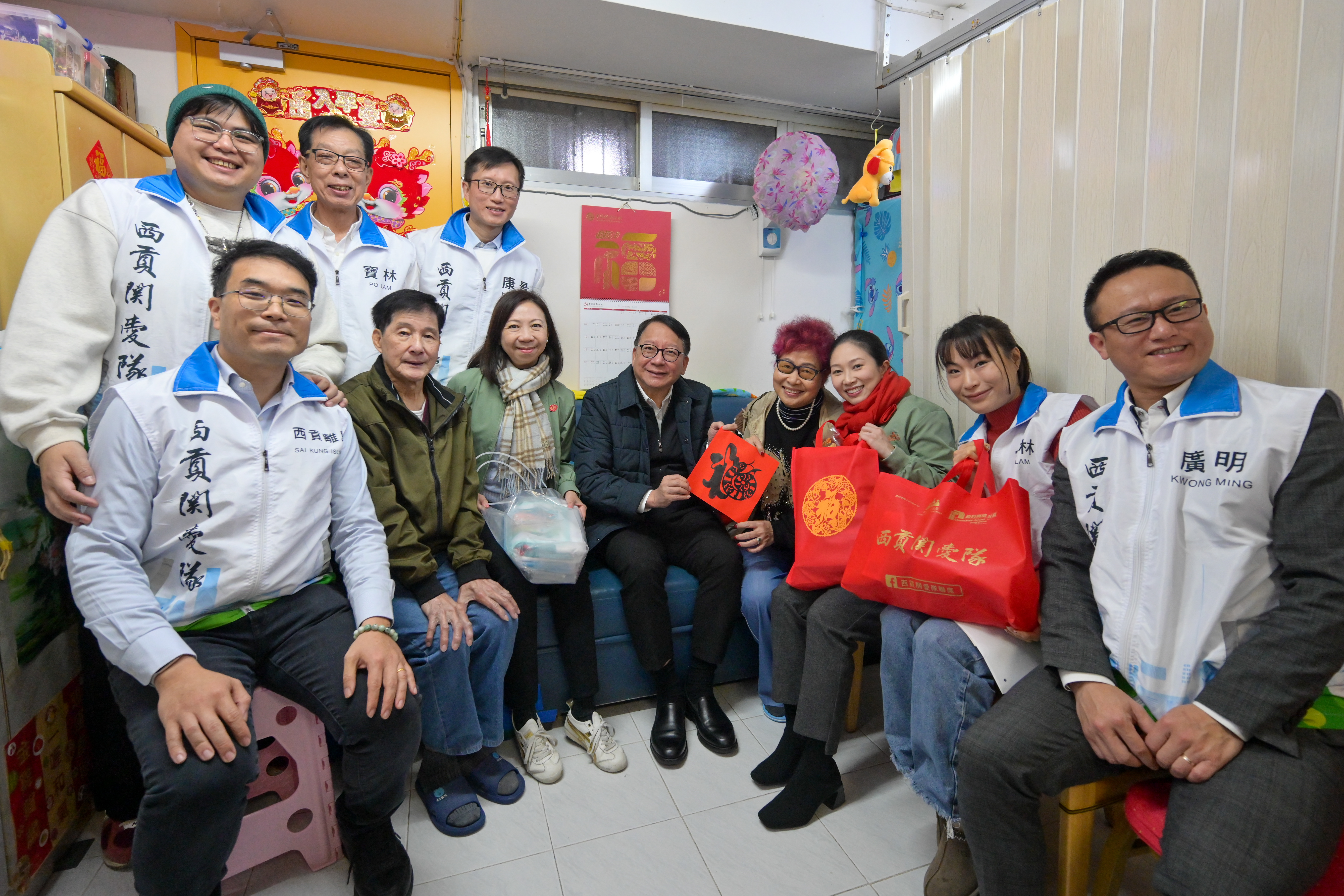 政務司司長陳國基和民政及青年事務局常任秘書長林雪麗今日在西貢民政事務專員馬瓊芬陪同下,聯同西貢區區議員和西貢區地區服務及關愛隊伍(關愛隊)代表,一起探訪居於寶林邨的獨居長者和雙老基層家庭,與他們閒話家常,共享節日歡欣。