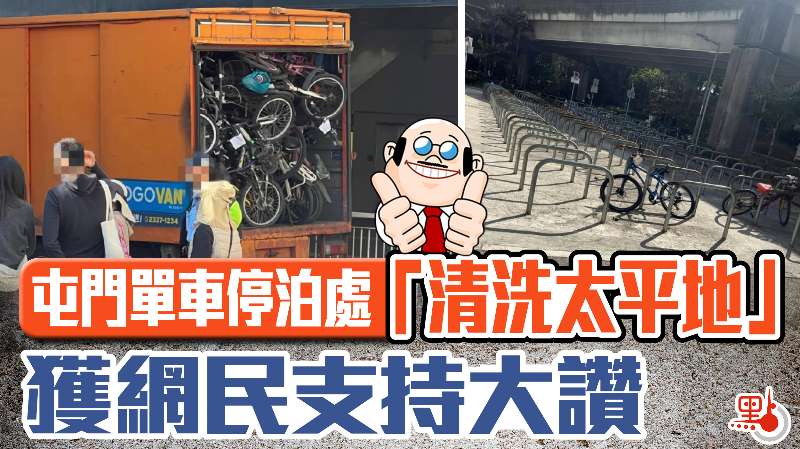 位於屯門輕鐵站附近的一個單車停泊位,平時擺滿單車,近日被發現已被全面清空。有網民在社交平台上載兩張相片,可見有關部門在港鐵屯門站外的單車停泊處「洗太平地」,移除違泊單車,但由於數量太多,一輛大型貨車被裝滿再無空間,場面十分誇張,清場後該單車停泊處空空如也,僅剩下兩部單車。
