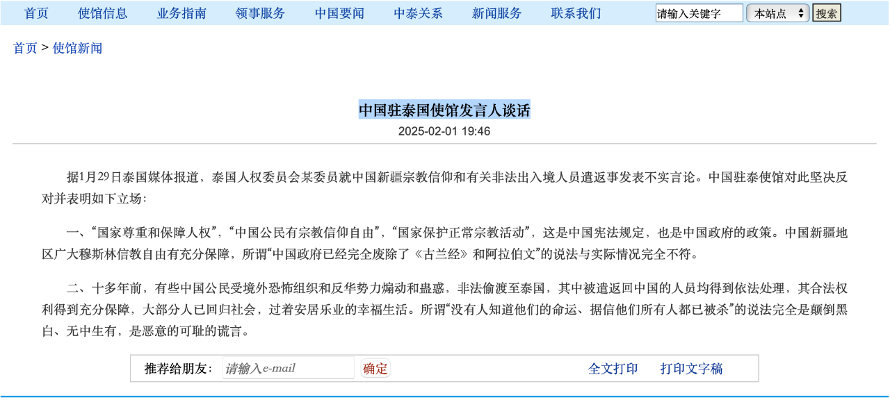 據中國駐泰國大使館網站2月1日消息,使館對此堅決反對並表明如下立場: