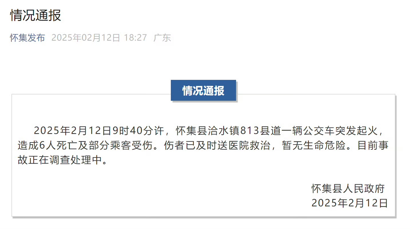 【點新聞報道】廣東省肇慶市懷集縣人民政府今日(12日)發布消息稱,今日上午9時40分許,懷集縣洽水鎮813縣道一輛公交車突發起火,造成6人死亡及部分乘客受傷。