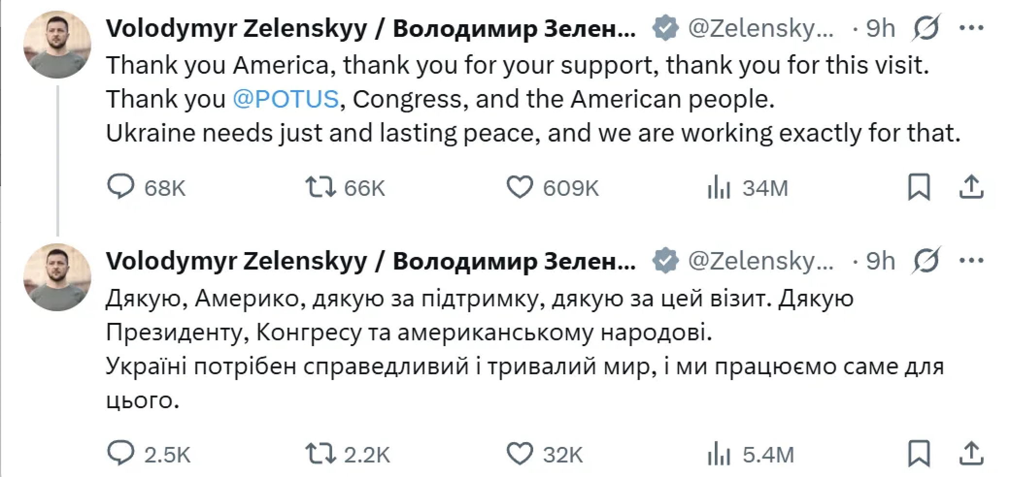 在被特朗普打斷並要求離開白宮後,澤連斯基用雙語發布推文:「謝謝美國,謝謝你的援助,謝謝安排這次出訪,謝謝美國總統、國會及美國人民」。他還表示,烏克蘭需要立即且長久的和平,烏克蘭正為此努力。