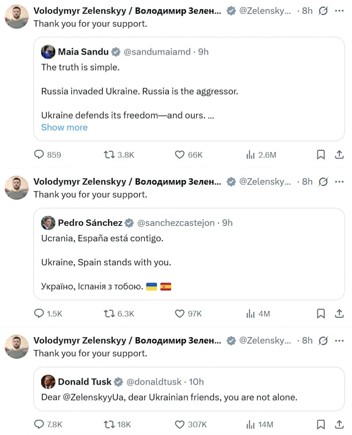 在美烏領導人「談崩」後,歐盟、法國、英國等歐洲多方領導人重申支持烏克蘭,澤連斯基連續轉發上述支持,轉發語均為「感謝你的幫助」。