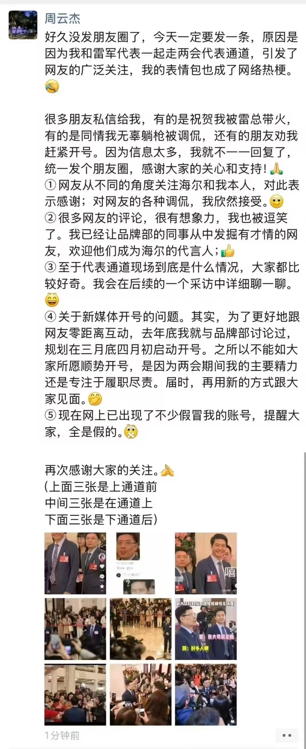 3月5日上午,周雲傑與雷軍在兩會「代表通道」同框亮相,引發網友討論熱潮,周雲傑的表情包更是在各大社交平台被網友廣泛傳播。3月7日,周雲傑在朋友圈發文表示,近期自己走在雷軍身後的表情包成為網絡熱梗,對網友關注表示感謝,對各種調侃也欣然接受。周雲傑表示,「網友從不同的角度關注海爾和我本人,對此表示感謝;對網友的各種調侃,我欣然接受。很多網友的評論,很有想像力,我也被逗笑了。我已經讓品牌部的同事從中發掘有才情的網友,歡迎他們成為海爾的代言人。」周雲傑表示,全國兩會期間,自己專注於履職盡責。現在網上已出現了不少假冒他的賬號,他提醒大家全是假的。