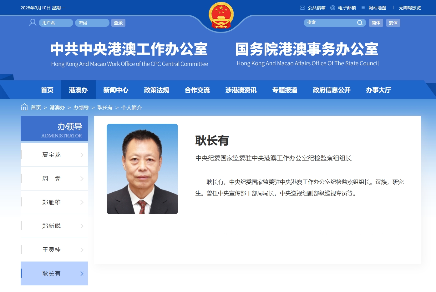 官網介紹,耿長有,中央紀委國家監委駐中央港澳工作辦公室紀檢監察組組長。漢族,研究生。曾任中央宣傳部幹部局局長,中央巡視組副部級巡視專員等。