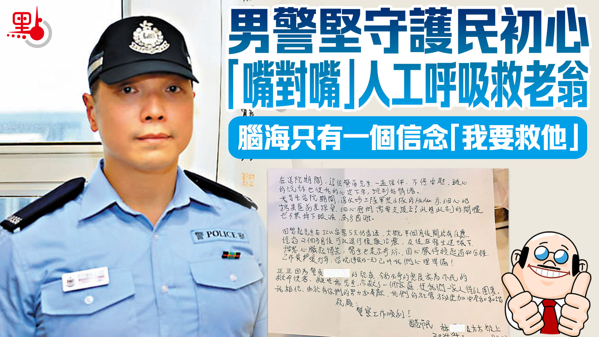 【點新聞報道】以救急扶危為天職的警員曾耀華,去年他在深水埗北河街熟食市場拯救一名暈倒的老翁時,在沒有任何防護裝備下,嘴對嘴為事主人工呼吸,老翁口吐食物殘渣仍繼續施救,直至對方面色漸轉紅及救護車到場。他憶述那刻腦海裏只有一個信念─「我一定要救這個人,因為他真的會死。」老翁獲救出院後更與妻子親到警署致謝,稱讚曾耀華是「救命使者」。
