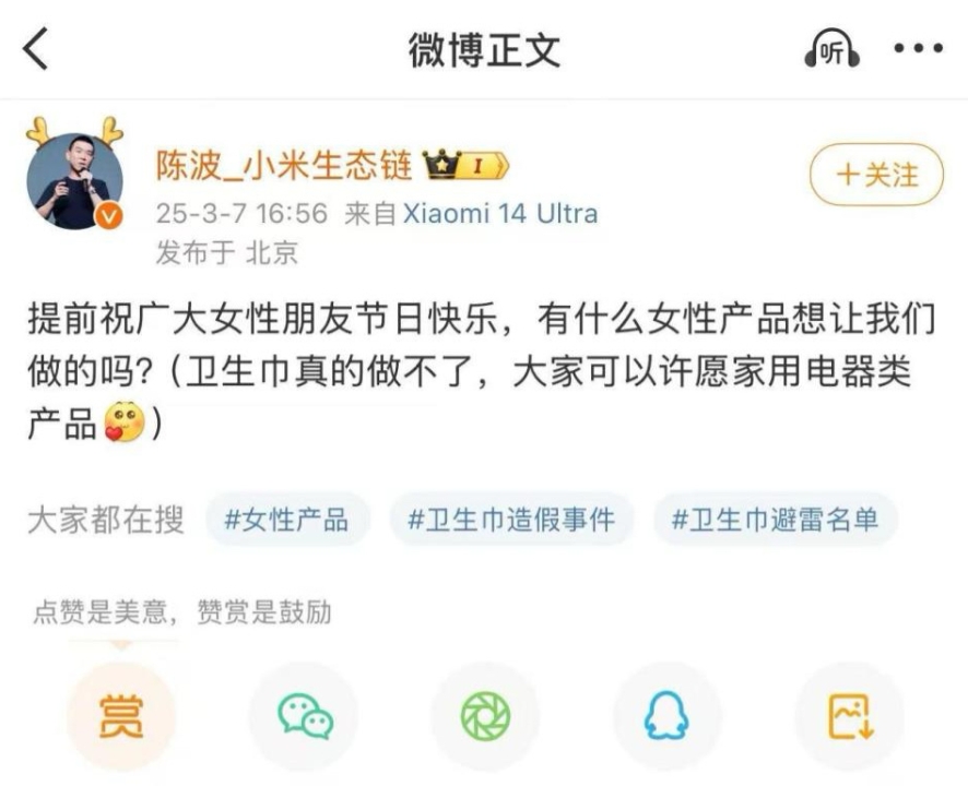 內地衞生巾市場多個品牌近期接連爆出質量問題,包括偷工減料及「翻新衞生巾」等醜聞,嚴重打擊消費者信心。去年底,已有網民呼籲小米創始人雷軍推出衞生巾,以提供安全可靠的選擇。陳波曾於3月7日在微博回應網民,表示「衞生巾真的做不了」,並建議大家許願家用電器類產品。然而,該條微博現已被刪除,進一步引發外界猜測。