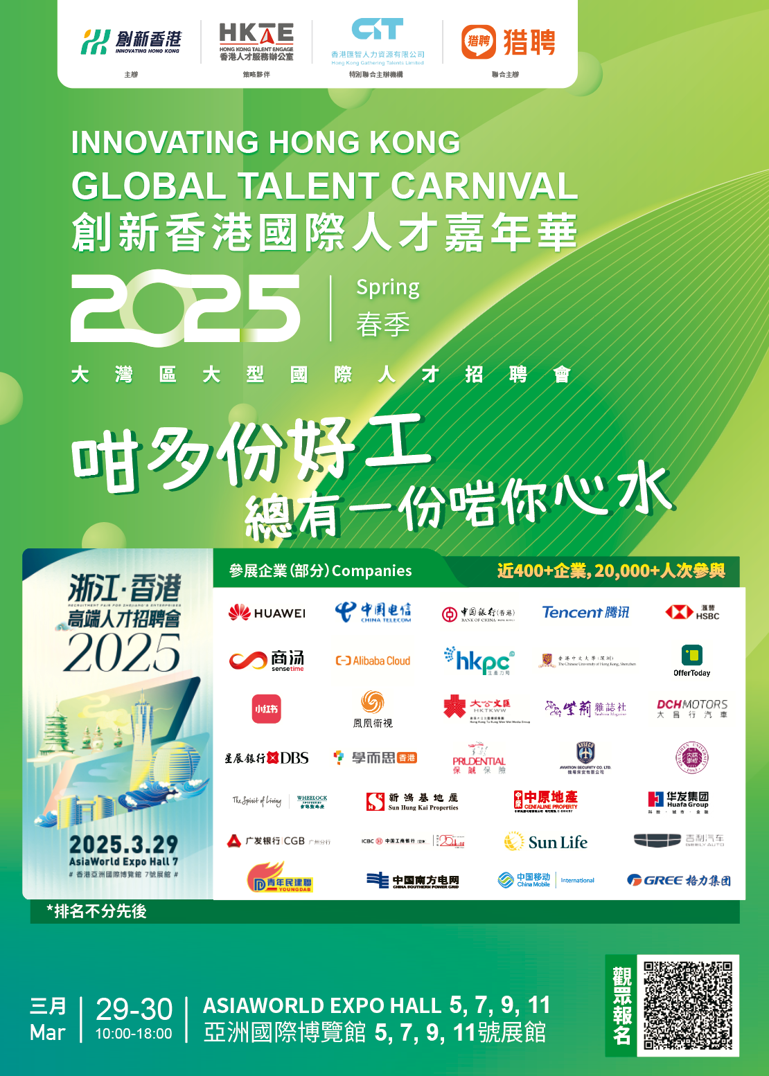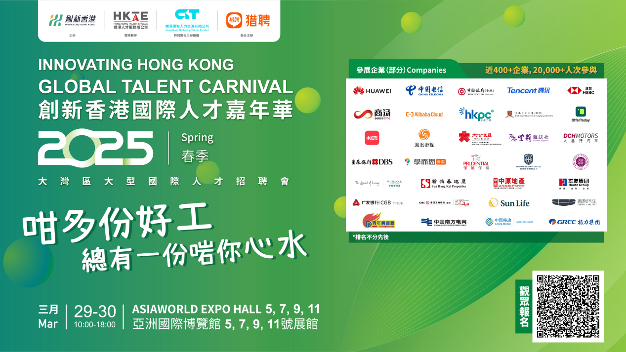 立即登記報名,帶上你的簡歷,於2025年3月29日至30日親臨創新香港—國際人才嘉年華,快來抓住屬於你的機會,開啟職業生涯的新篇章!