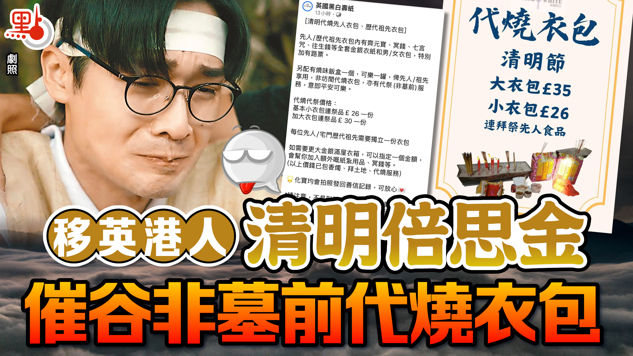有一個名為「英國黑白壽紙」專頁,近日在移英港人群組催谷生意,指可以提供「清明代燒先人衣包、歷代祖先衣包」,服務內容為:先人/歷代祖先衣包內有齊元寶、冥錢、七言咒、往生錢等全套衣紙和男/女衣包,特別加有路票;另配有燒味飯盒一個,可樂一罐,畀先人/祖先享用,非坊間代燒衣包,亦有代祭服務,之不過,就註明不是到墓前代祭,係當天請祖先,會先拜土地。