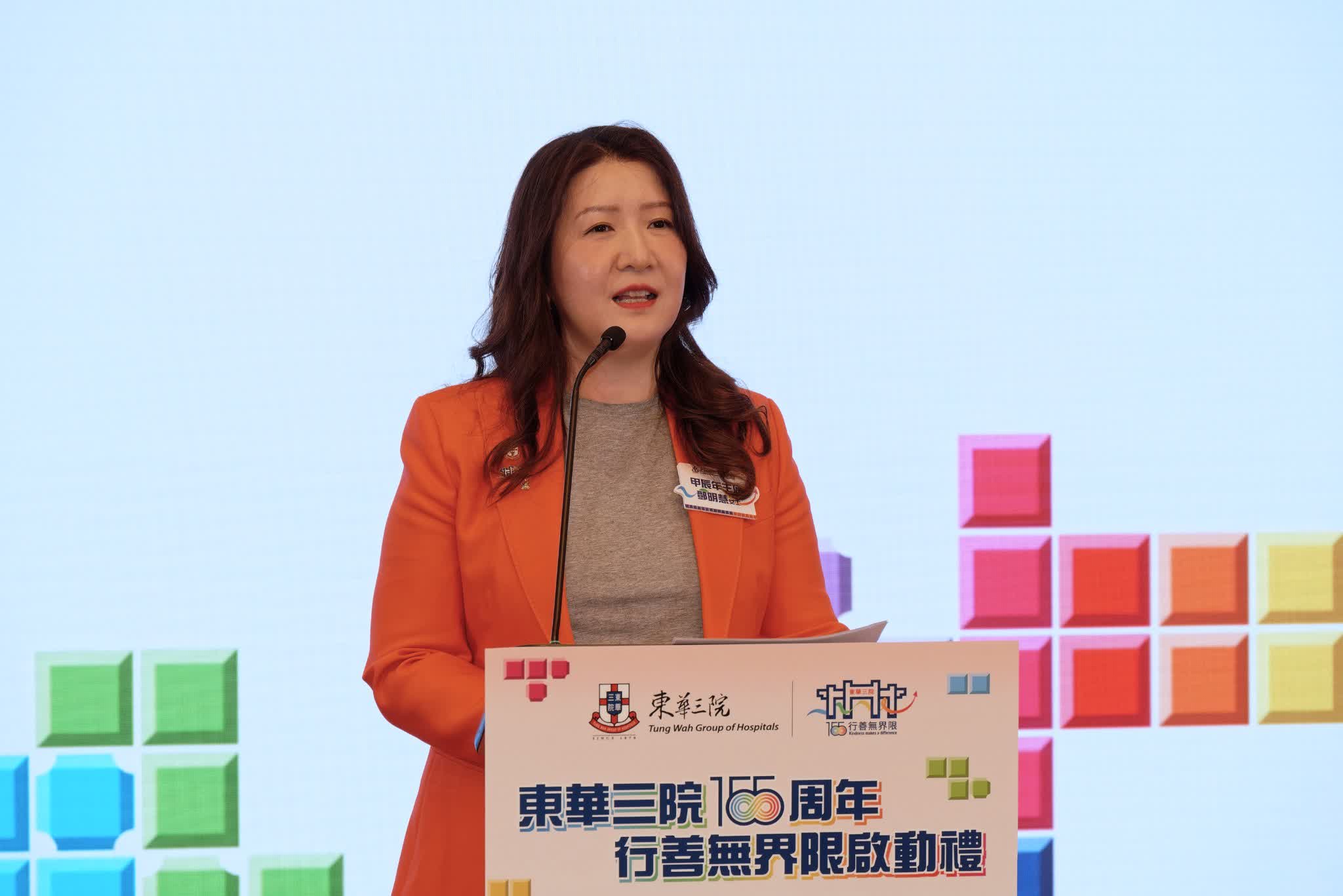 鄧明慧於啟動禮致辭時表示:「東華三院於1870年從一個在廟宇內小小的中醫診療亭開始,發展至今155載,現時共有392個服務單位,是香港歷史最悠久、規模最大、服務最多元化的慈善機構。東華三院155周年的誌慶口號 『行善無界限』,彰顯了本院不分界限、持續行善的慈善精神——從過去到未來,行善的腳步從未止息,推動的善業不分畛域,屢創可能。此外,東華三院亦策劃了一系列慶祝活動,並推出了全新主題曲《源遠的歌》,用音符記錄與港人同心同行的故事,傳承行善精神。」她續說,展望未來,東華三院將繼續發揮優勢,凝聚各界力量,把握國家發展機遇,善用粵港澳大灣區資源,全力推動各項服務的發展。