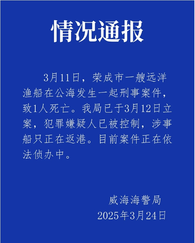 【點新聞報道】3月24日深夜,山東威海海警局發布情況通報。通報指,3月11日,榮成市一艘遠洋漁船在公海發生一起刑事案件,致1人死亡。