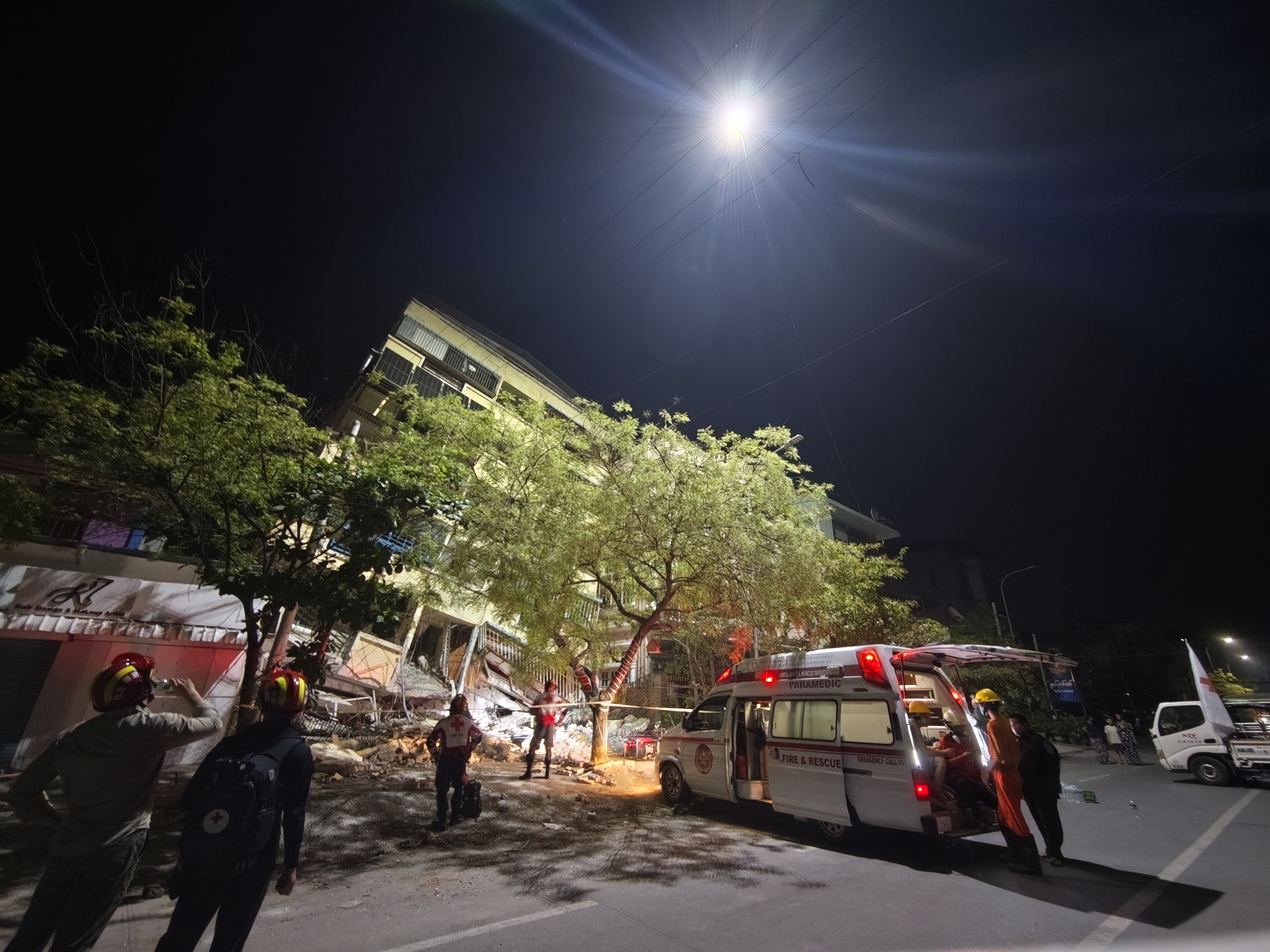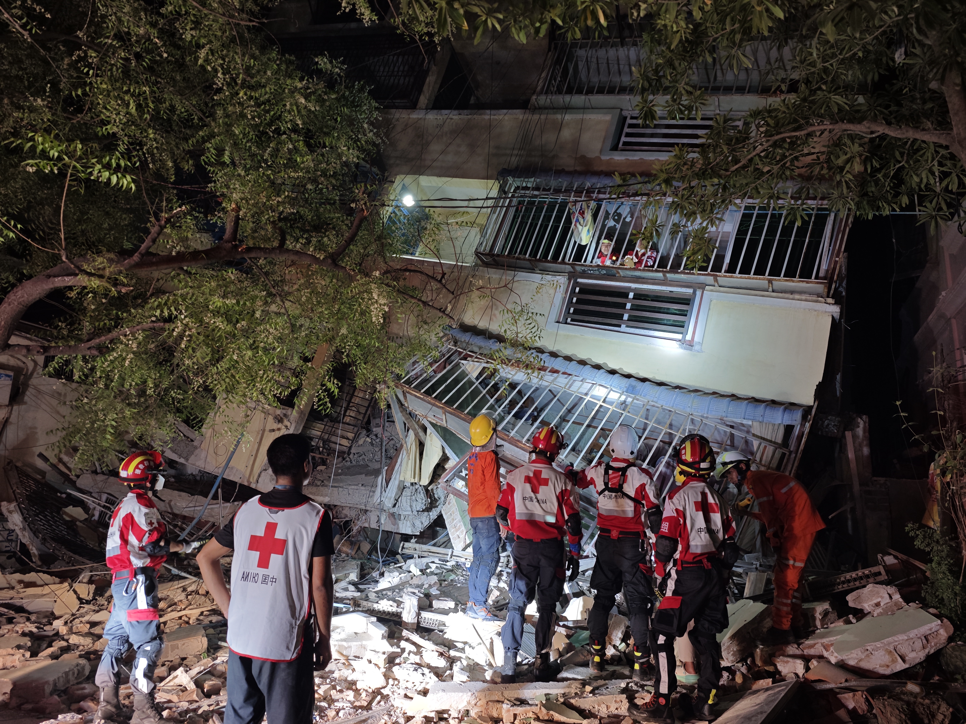 中國紅十字國際救援隊一行15人,3月31日一早抵達緬甸曼德勒市,隊員立即在該市開展破拆搜救、護理轉運、醫療救助和心理疏導等抗震救災工作。晚上7時10分,救援隊接到求助,在曼德勒68-41地區,倒塌的六層樓一樓超市有一名22歲女生被壓。抵達現場後,救援隊發現這裏晚上斷電沒有照明,隊員立即開啟無人機照明。「China,非常棒!」救援隊的沈廷沖說,當無人機飛上天空的時候,當地的百姓都在鼓掌。