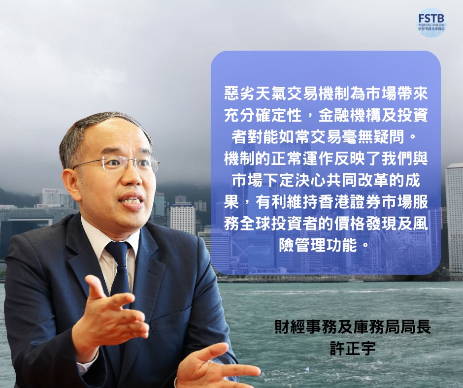 財庫局局長許正宇今日在社媒發文表示,行政長官去年宣布,香港交易及結算所於同年9月23日起實施證券市場在惡劣天氣下不停市的安排,今日是香港首次在一個完整交易日內維持運作。