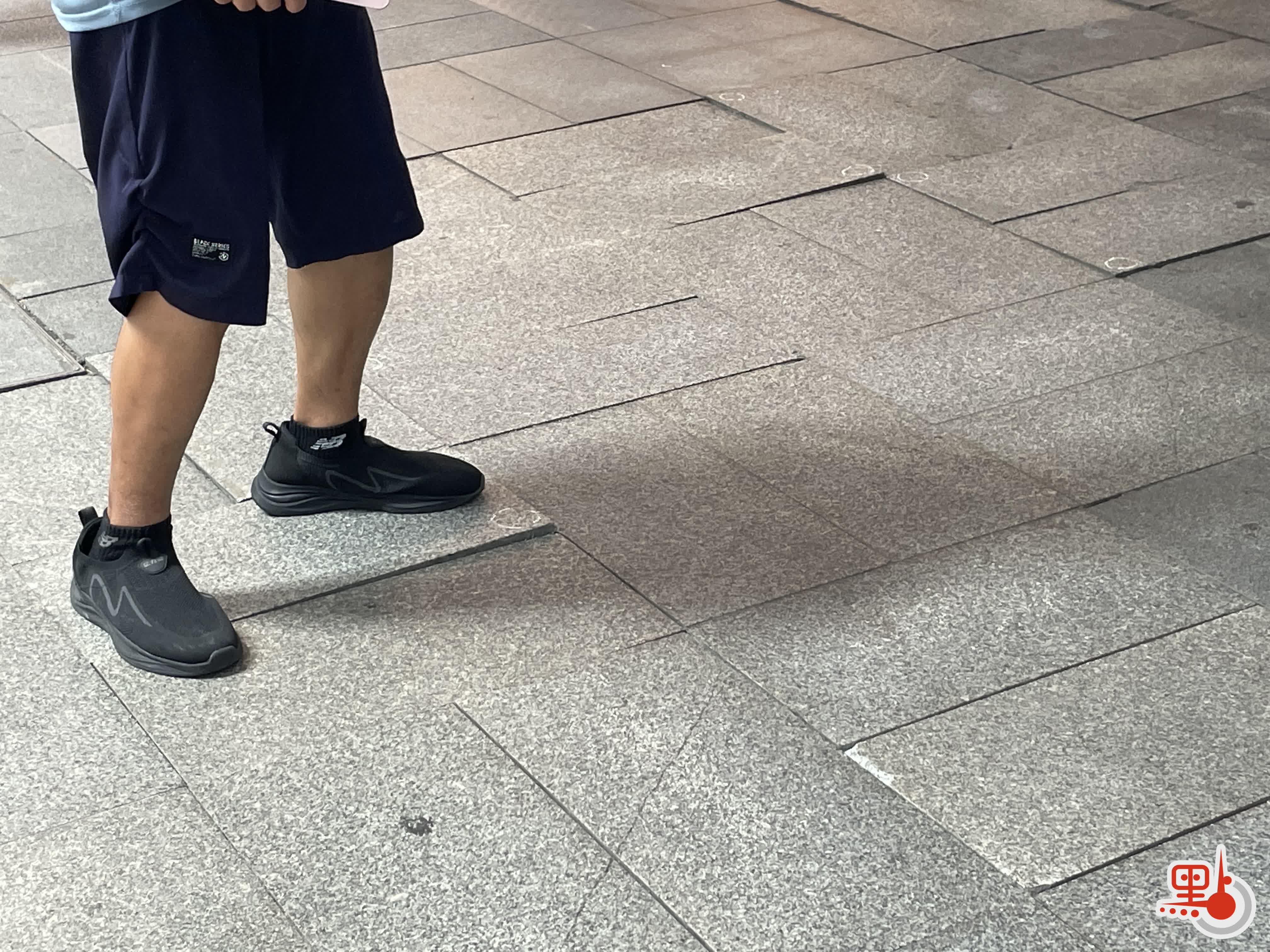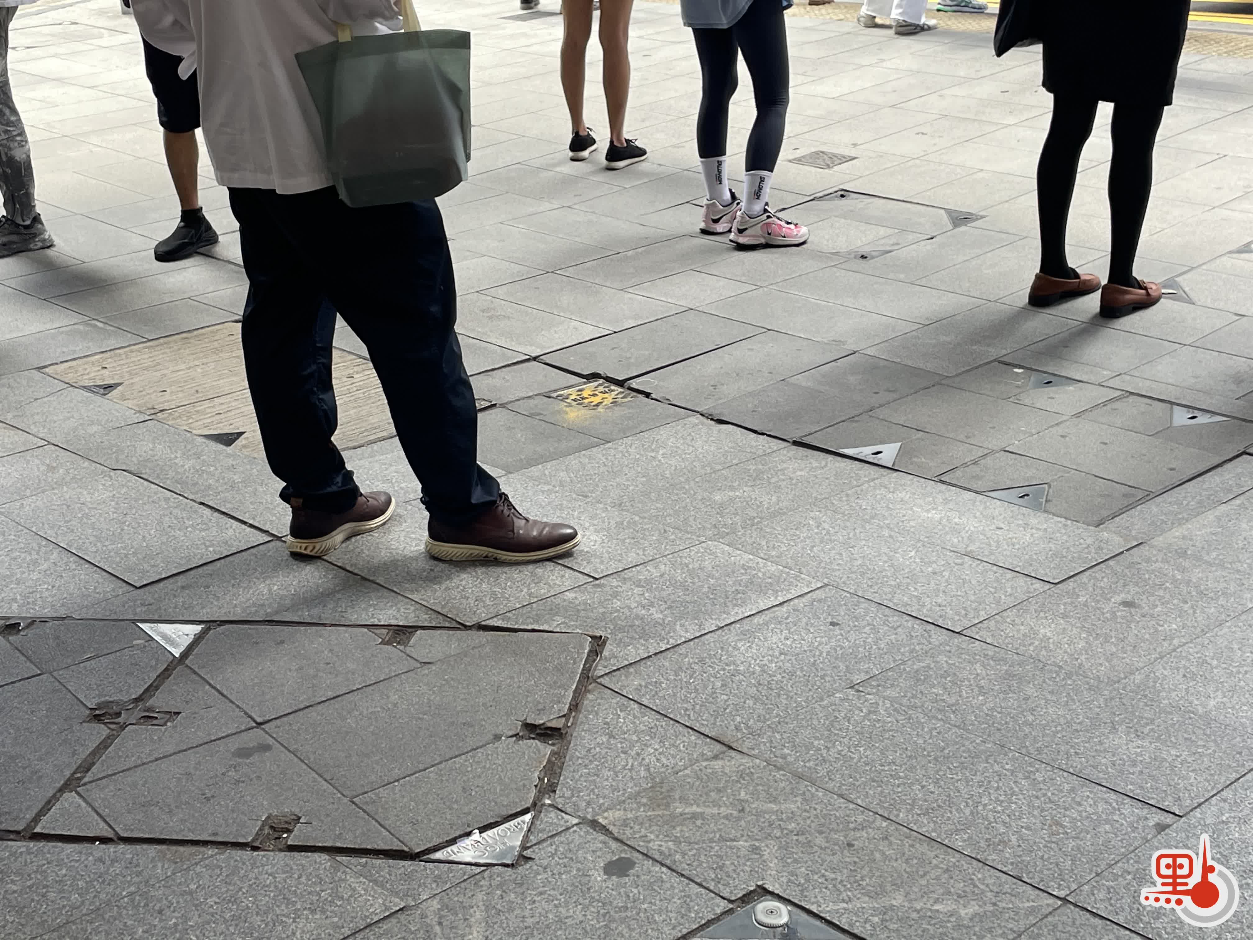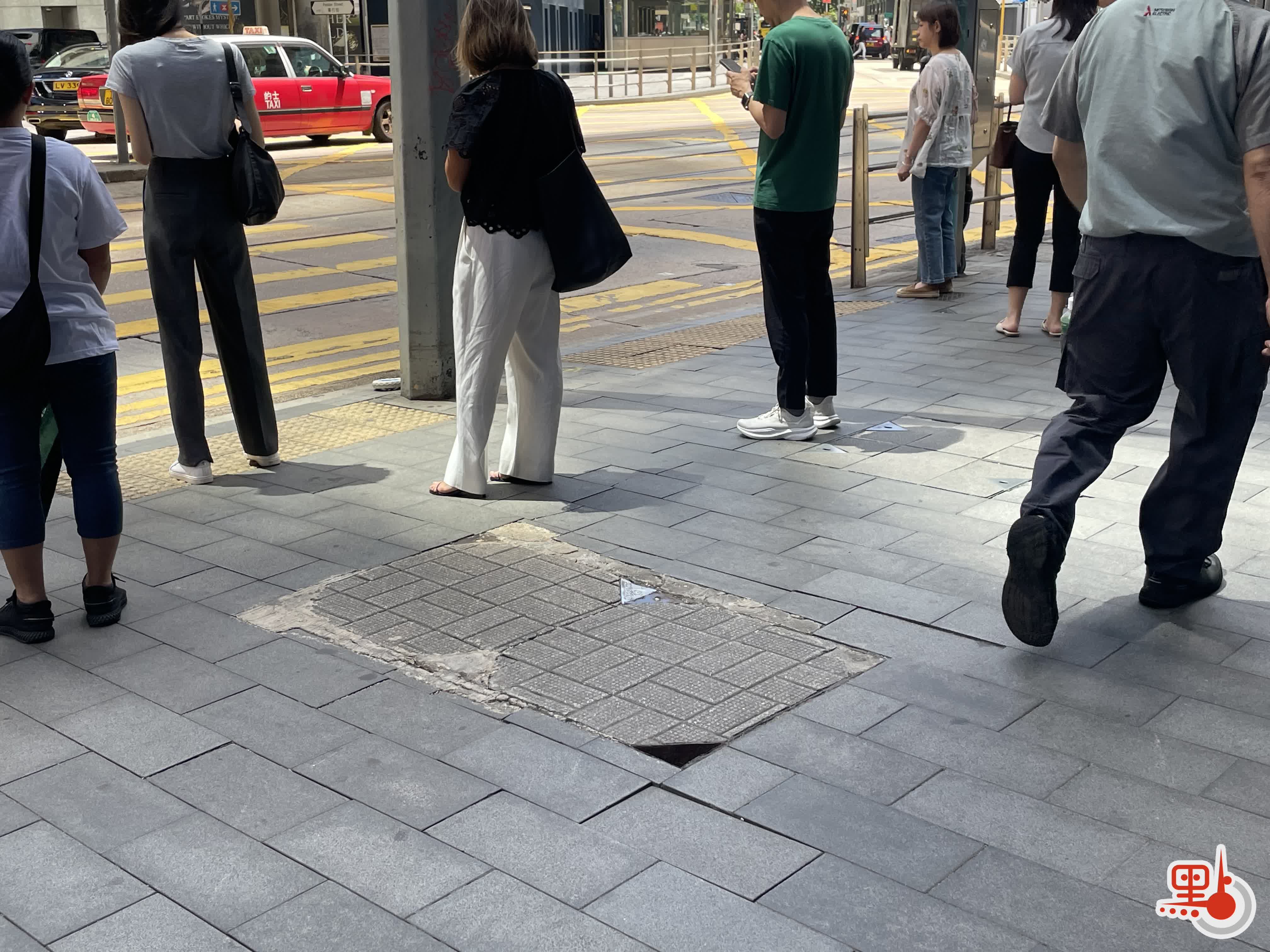 另外,中環站C口處附近,行人路面瀝青與地磚混和鋪製,導致路面不平,甚至有一處井蓋出現缺口,缺口大小近乎幼童腳掌大小。