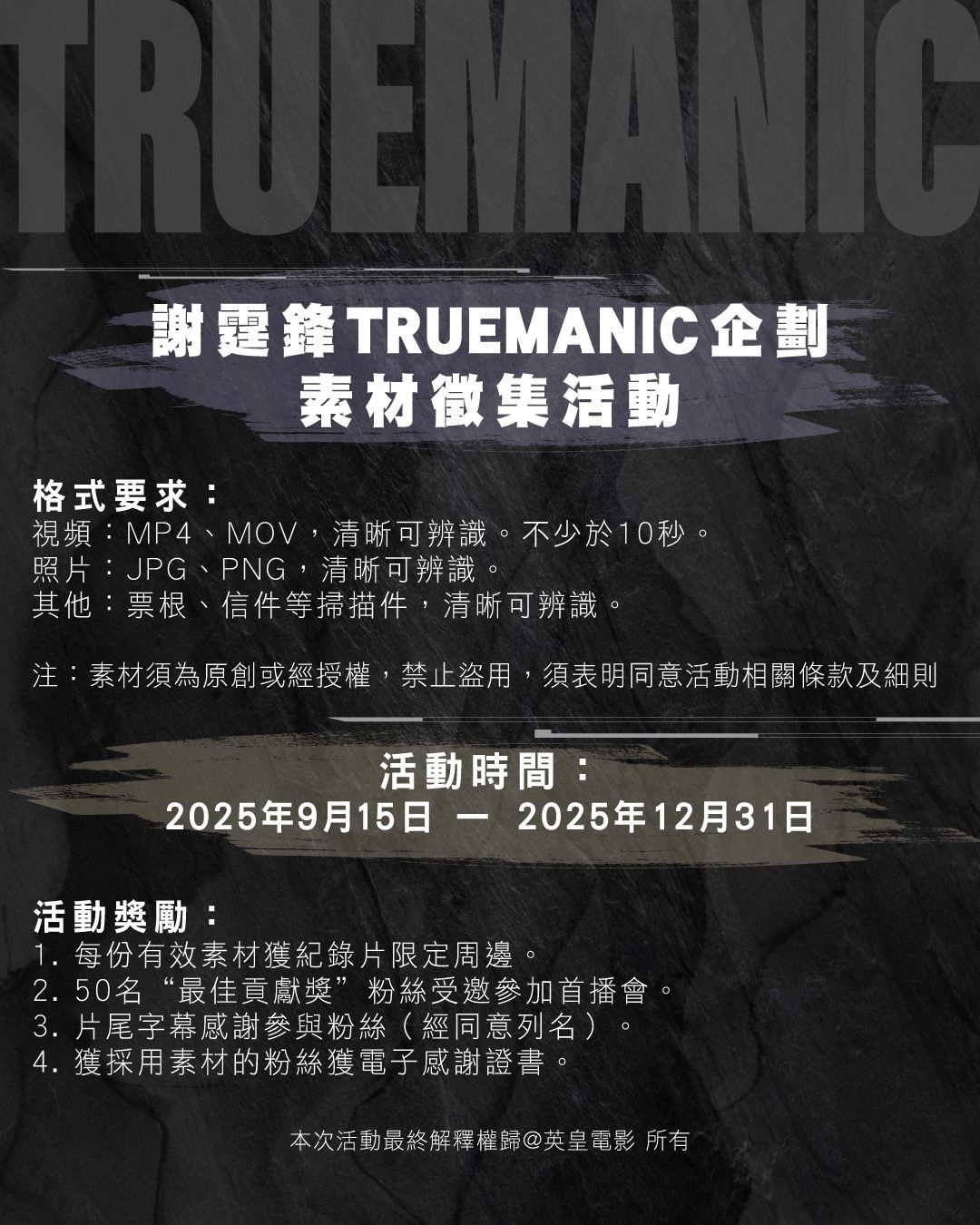 宣傳短片中,謝霆鋒首次跟大家分享自己的小學成績表,霆鋒笑言:「可能我個樣爛仔咗少少,但係都幾多A㗎!」幽默之餘令人感受到他身上滿滿的生活感。而成績表上那張稚嫩萌爆的小學證件照,也讓人忍不住想探究更多有關謝霆鋒的生活碎片。霆鋒提及,自己過往的45年很像一場真人Show,而在場的各位都是他的人生觀眾,發起「Truemanic素材徵集活動」的初心是想通過更多的視角,來記錄自己曾經真實走過的日子,同時想通過這次機會來讓粉絲道出潛藏已久的故事。