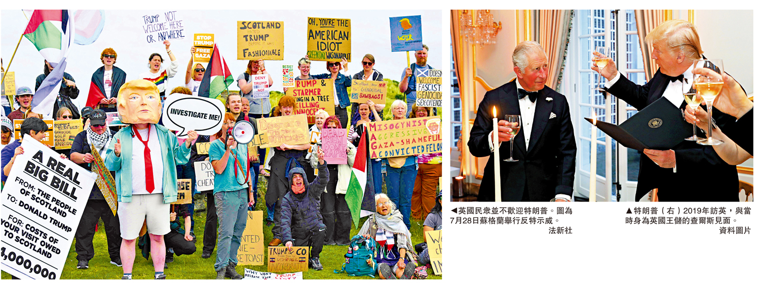 大公報綜合報道,美國總統特朗普將於當地時間16日晚抵達英國,進行第二次國事訪問。英國政府放風,稱兩國將簽署一系列能源和科技合作協議。有分析指出,英國首相斯塔默領導的政府近期醜聞纏身,希望利用特朗普的訪問轉移公眾視線;特朗普則將享受英國王室的盛情招待,滿足自己的虛榮心,並通過深化與英國的關係制衡歐盟。不過,很多英國民眾並不歡迎特朗普,計劃於17日舉行大規模反特示威。