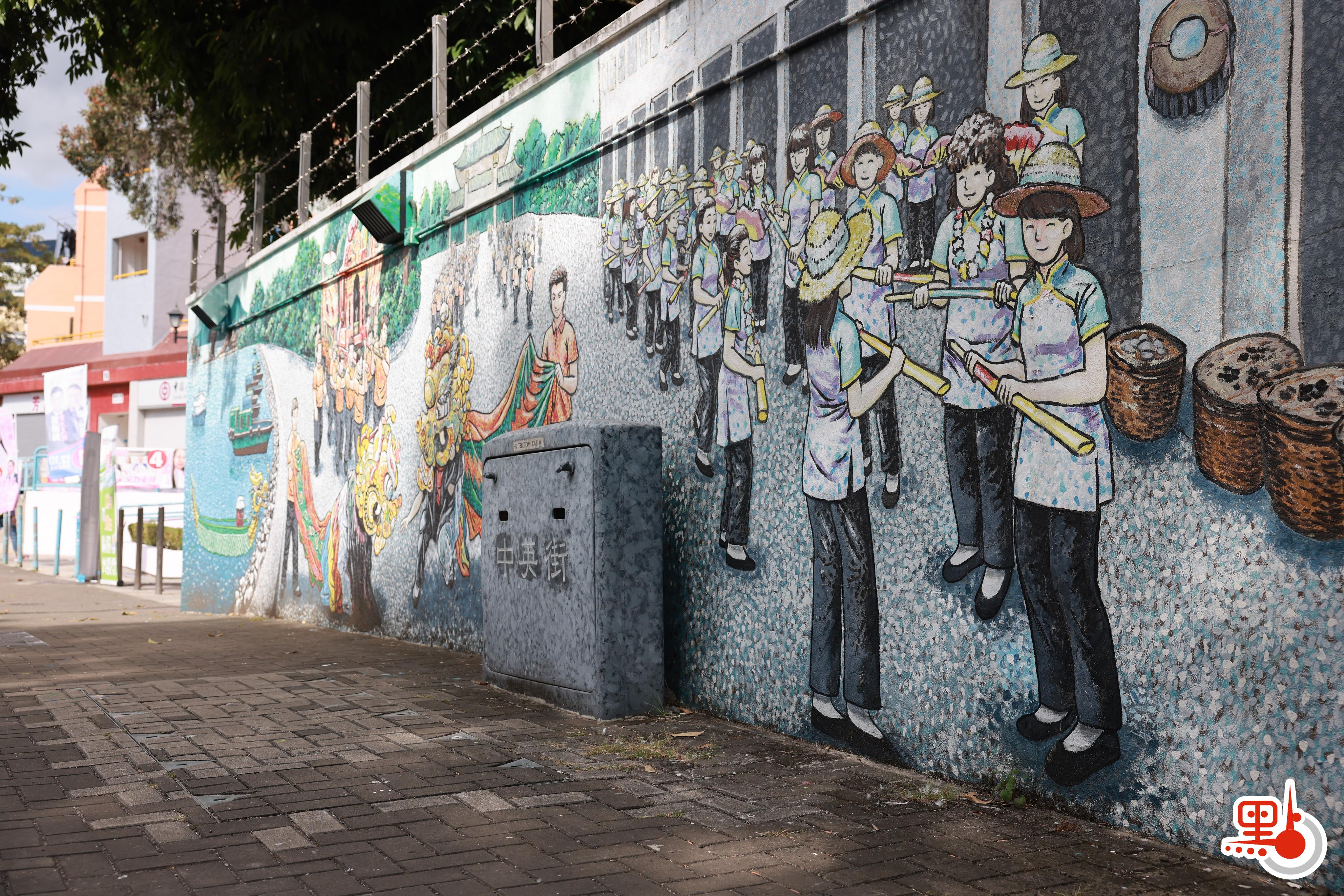順平街緊鄰舊消防局,街名寄寓「順利平安」的美好祈願,更藏着兩處亮眼景致——兩幅精工繪製的壁畫,將沙頭角標誌性的酬神慶典鮮活定格。沙頭角至今延續傳統:每年舉辦天后誕,每十年更有一場盛大慶典,居民齊聚歡慶,其中鶴佬婦女演繹的「陸上龍舟」舞尤為獨特。壁畫細緻勾勒慶典盛景,熱鬧氛圍躍然牆上,遊人駐足間,便能直觀感受這份傳承已久的民俗活力。
