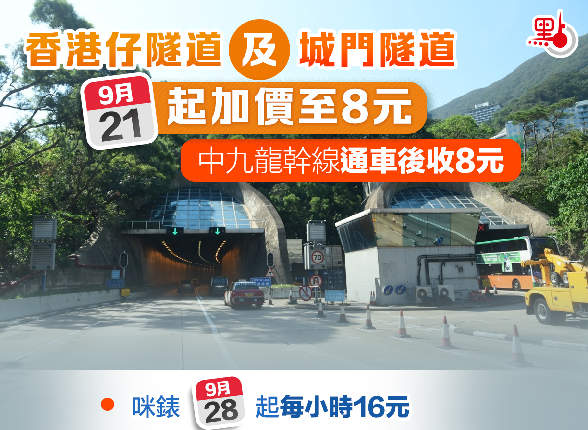 香港仔隧道及城門隧道周日起加至8元 咪錶9·28起每15分鐘4元
