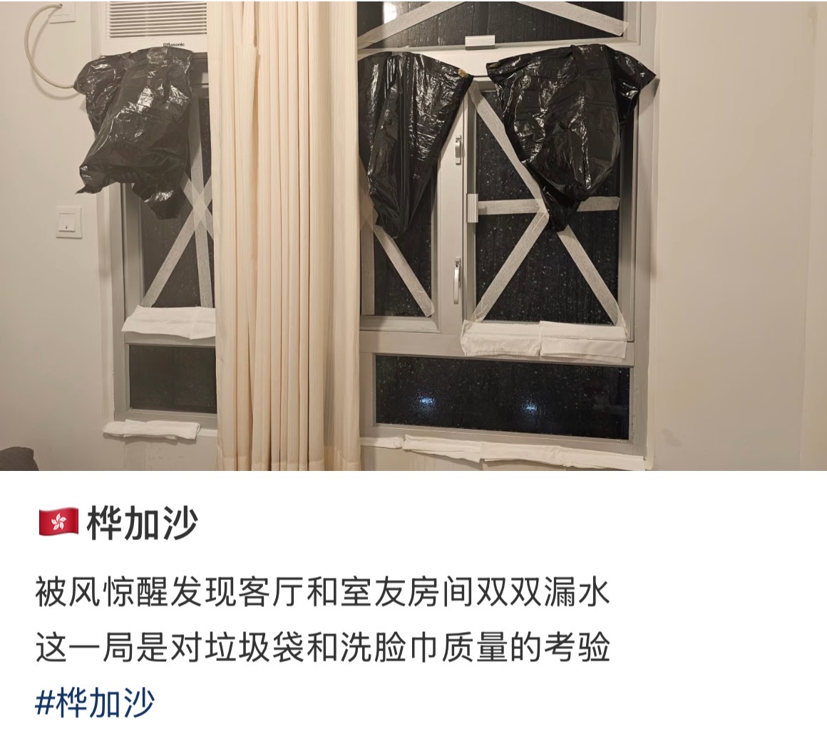凌晨被風聲驚醒,發現客廳和室友房間雙雙漏水?不慌!香港市民立刻化身「防水工程師」,垃圾袋、洗臉巾齊上陣。