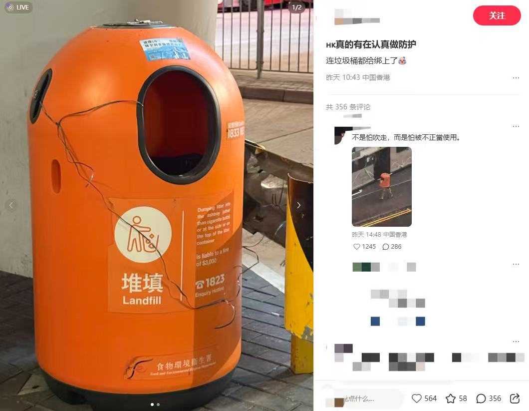 香港更是把防颱風做到了極致——連垃圾桶都給綁上了!有網友調侃:「不是怕吹走,而是怕被不正當使用。」